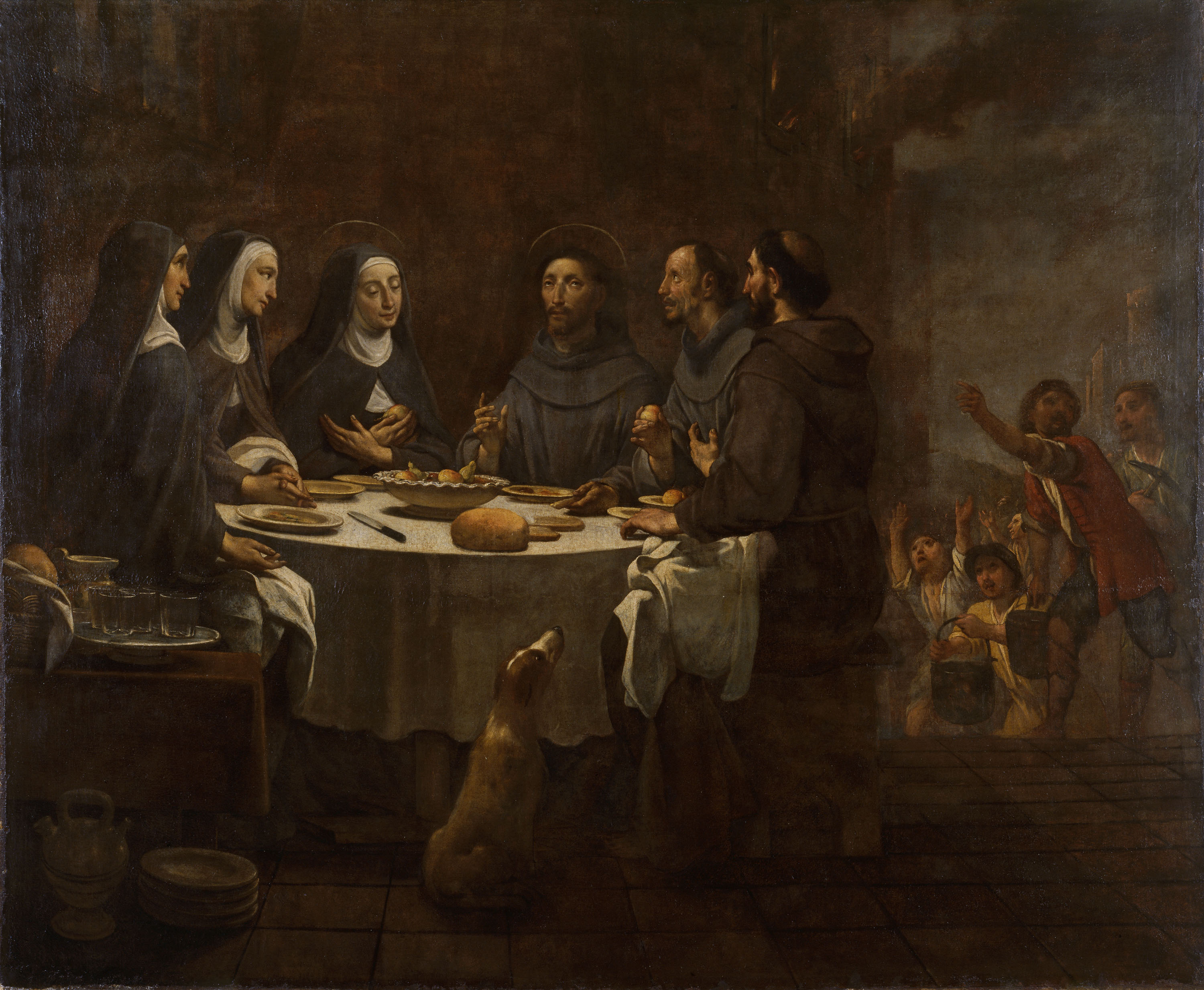Non è facile trovare altre opere con questo soggetto. In Toscana, si possono ricordare due dipinti del ‘600. Il primo, in ordine cronologico, è attribuito a Giovan Pietro Naldini (Settignano 1580 – Prato 1642) e si trova nel Museo Civico di Prato, indicato, con la consueta sottovalutazione della fonte letteraria, come La cena eucaristica di San Francesco e Santa Chiara. Proviene dall’altare del convento femminile di Santa Chiara in Calimala a Prato e, curiosamente, è realizzato su una tela da tovaglia. Sulla tavola imbandita si vedono vino, sale, uova, pane e salame. Il secondo dipinto si trova a San Miniato (Pisa), nel grande complesso francescano dedicato a San Francesco. Il refettorio conventuale conserva una grande tela del fiorentino Carlo Bambocci (1632-97), descritta nei testi come La cena di San Francesco e Santa Chiara (1691). Il dipinto più noto, tuttavia, si trova in Spagna, a Barcellona, esposto nel Museo Nazionale d’Arte di Catalogna con il titolo La cena di San Francesco e Santa Chiara nel convento di San Damiano (in realtà l’incontro, come sappiamo, avviene a Santa Maria degli Angeli). E’ opera di Antoni Viladomat (Barcellona 1678-1755) e fa parte di una serie di venti tele sulla vita di San Francesco, databili al 1729-33, provenienti dall’ex convento di San Francesco in Barcellona.