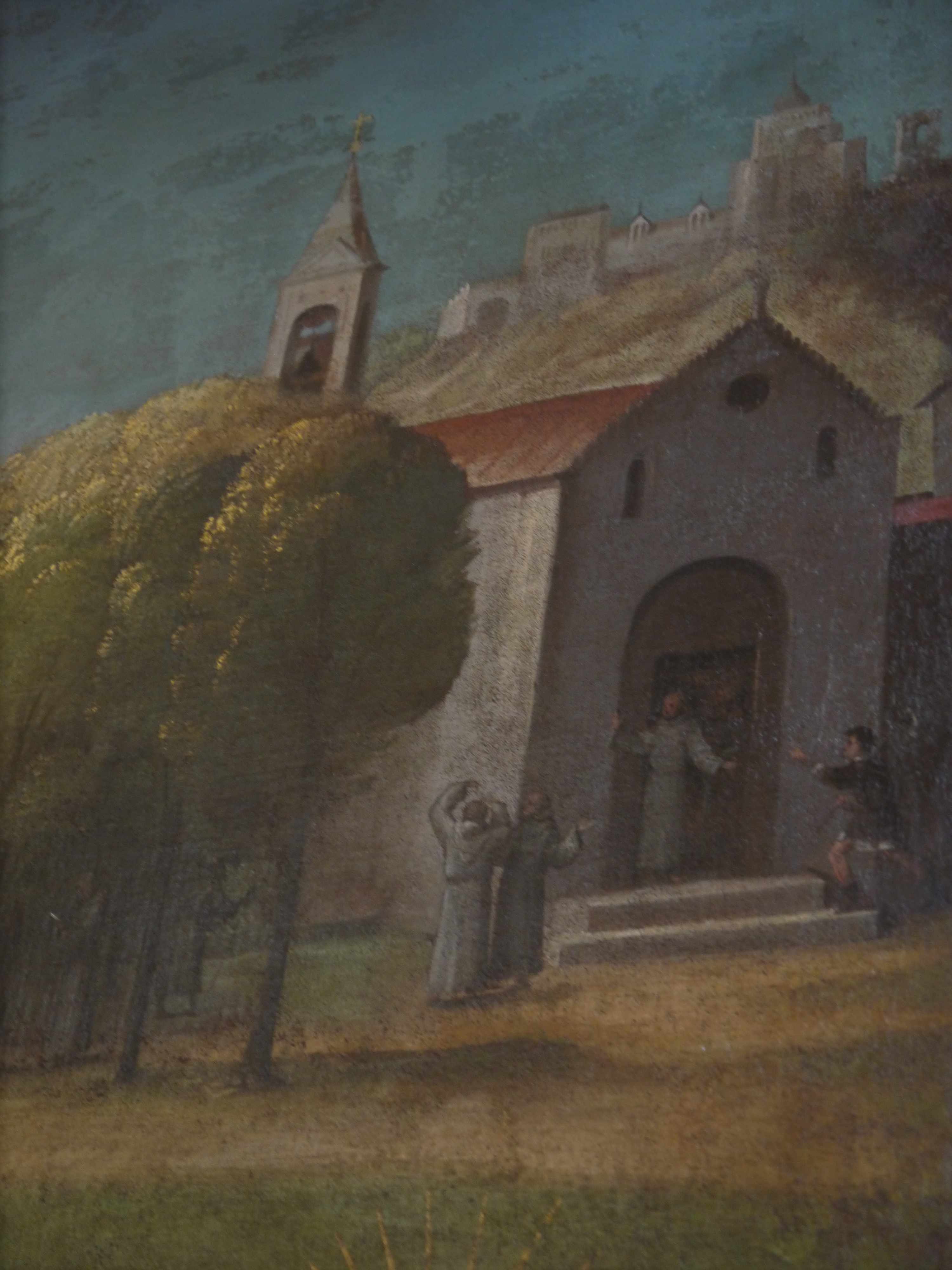 Osserviamo il paesaggio nel dipinto. Una vasta pianura fra due rilievi e, quasi all’orizzonte, un lago. Assisi è ben riconoscibile, sul colle in alto a sinistra. Si distinguono, disegnati con qualche verosimiglianza, una porta urbica, il duomo di San Rufino (ma in facciata c’è una trifora al posto del rosone) e, inconfondibile, la basilica di San Francesco (un anacronismo: la prima pietra verrà posata solo due anni dopo la morte del santo). Al termine della pianura, sullo sfondo, il Lago Trasimeno, con i suoi borghi fortificati (Magione? Castiglione del Lago?). Quasi al centro della piana, una cappella isolata, da identificarsi con la Porziuncola. A destra, un folto gruppo di alberi (è il “Cerreto di Porziuncle”, l’antico bosco citato dalle fonti, la “selva, ch’ era allora allato al luogo” dell’episodio dei Fioretti). Dietro gli alberi, sorge una chiesa più grande con campanile e altri edifici, appena accennati. Si tratta, presumibilmente, del primitivo convento di Santa Maria degli Angeli. Come è noto, per volere di Papa Pio V (domenicano e santo, celebre per la Battaglia di Lepanto), a partire dal 1569 viene costruita la monumentale basilica che, con i suoi annessi, inglobò la Porziuncola, altre cappelle legate alle memorie francescane, nonché l’antico convento. Lo sfondo di paesaggio termina, a destra, oltre la chiesa conventuale, con la sommità di una rupe fortificata, di più difficile identificazione. Potrebbe trattarsi del borgo di Bettona, citato, con Assisi, nell’episodio dei Fioretti (anche se assomiglia molto alla Rocca Maggiore della stessa Assisi).