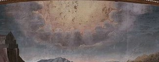 Descritte le cinque figure, è il momento di capire che cosa sta accadendo. Una volta seduti a tavola, prima di mangiare Francesco cominciò a parlare di Dio sì soavemente, sì altamente, sì maravigliosamente, che la grazia divina discese su di loro e tutti furono rapiti in estasi. E mentre se ne stavano così rapiti, con gli occhi e le mani alzate verso il cielo, da Assisi, Bettona e dal territorio circostante sembrò che Santa Maria degli Angeli, la chiesa, la pianura e il bosco andassero a fuoco come per un grande incendio. Al che gli Assisani in tutta fretta corsero giù a valle per spengere le fiamme, credendo veramente ch’ ogni cosa ardesse: questo è il momento del racconto illustrato nel dipinto. Il testo continua, spiegando che gli uomini di Assisi, giunti nel luogo dell’incendio, non vedendo alcun fuoco materiale, compresero che si era trattato di un fuoco divino, segno del divino amore di cui ardevano le anime di quei santi frati e sante monache.