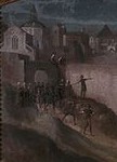 Chiara, invitata da Francesco, lascia il convento di San Damiano. Appena giunta a Santa Maria degli Angeli, si reca a pregare in Porziuncola, davanti all’altare della Vergine, dove le erano stati tagliati i capelli ed aveva abbracciato la vita religiosa (E salutata divotamente la Vergine Maria dinanzi al suo altare, dov’ella era stata tonduta e velata…). Nel dipinto, come già detto, la Porziuncola è identificabile nella cappella isolata, quasi al centro della pianura. Se si osserva bene, si notano piccolissime figure umane, dentro e fuori la chiesetta. Inginocchiati in preghiera, di fronte all’ingresso, si riconoscono, per la veste e per le aureole, Santa Chiara e San Francesco. Ma è all’interno che appare un particolare insolito: una scena di Annunciazione, una sorta di apparizione miracolosa davanti ai due santi in preghiera, con l’angelo inginocchiato e benedicente che porta gigli bianchi a Maria. Una scena assolutamente inedita, non riscontrabile in alcuna fonte francescana. Nei Fioretti si parla di un altare dedicato alla Madonna (il titolo della chiesa, difatti, è Sancta Maria de Portiuncle) e si può supporre che ai tempi di Chiara e Francesco ci fosse un’immagine della Vergine, dipinta o scolpita. Qui, però, vediamo chiaramente una scena di Annunciazione. Ebbene, nel 1393 (ci sono data e firma) Prete Ilario da Viterbo, pittore, esegue la grande pala per l’altare della Porziuncola, con Storie del perdono di Assisi, visibile ancora oggi. Il pannello centrale raffigura proprio un Annunciazione (e anche qui l’angelo, pur nell’ovvia diversità di stile, è inginocchiato e benedicente). Onestamente, non sembra una coincidenza. La minuscola Annunciazione della nostra tela, quasi un “dipinto nel dipinto”, pare davvero un riferimento puntuale al vero altare della Porziuncola. Un dettaglio veramente speciale.