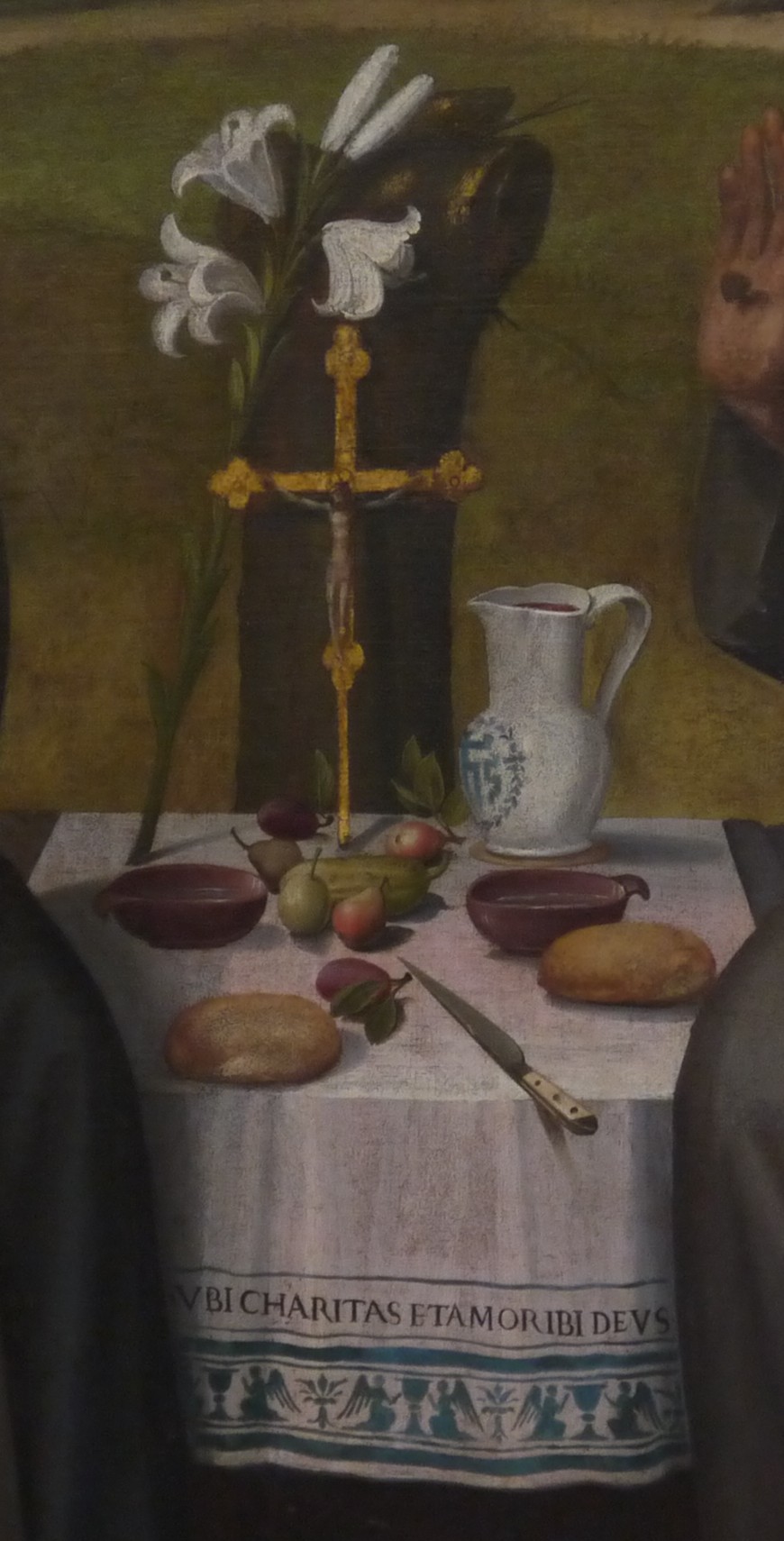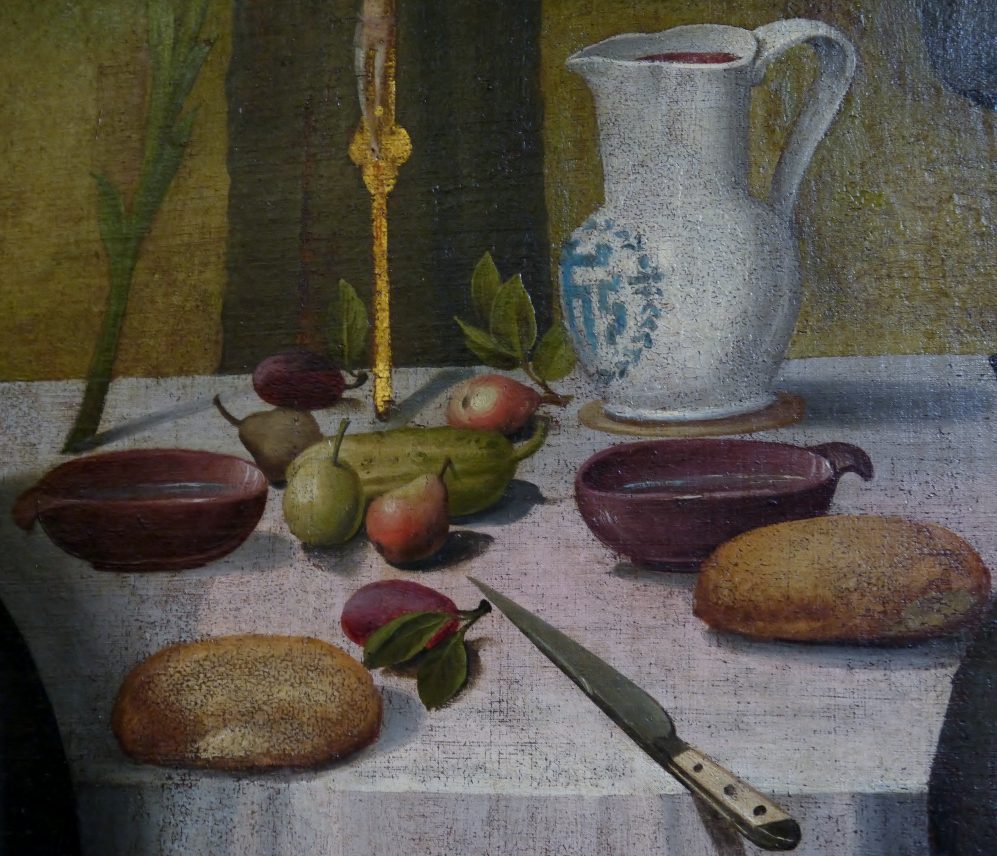 Nel dipinto, oltre al crocifisso e ai gigli di cui si è già detto, sulla tovaglia sono disposti un boccale contenente vino rosso, frutta, due ciotole di legno (riempite di acqua o minestra), due pani e un coltello dal manico in osso. Il boccale, associabile alle produzioni conventuali montelupine del XVI sec., è in maiolica bianca con al centro, in blu, il trigramma di Cristo diffuso da Bernardino da Siena: JHS (indizio di una provenienza francescana osservante). Per quanto attiene la frutta, si possono distinguere, verosimilmente, due prugne e quattro pere. C’è poi una cucurbitacea, forse una zucca o un cetriolo. Se le prugne, dal colore rosso-violaceo, potrebbero significare la passione e morte di Cristo, nonché la sua charitas, le pere (qui di tre tipi) sono spesso associate alla Vergine e a Gesù per la loro dolcezza che richiama la soavità delle virtù cristiane. C’è anche una tradizione secondo cui l’albero della vita dell’Eden sarebbe stato un pero. Con il legno dell’albero della vita, secondo la Leggenda della vera croce, sarebbe stata costruita la croce di Cristo. Le pere, pertanto sarebbero un altro riferimento, come le prugne, al sacrificio di Gesù. Infine, la cucurbitacea, sia essa una zucca o un cetriolo, è spesso un attributo del profeta biblico Giona, “figura”, per i cristiani, di Cristo morto e risorto.