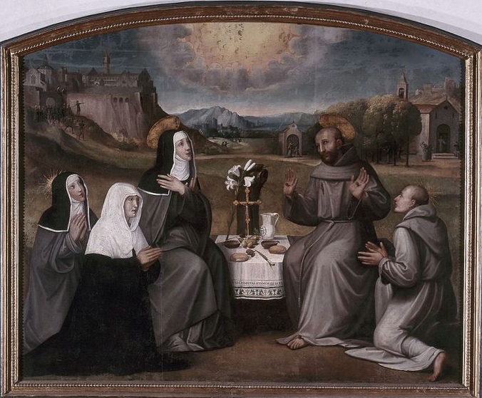 L’impressione è quella di una comprensione parziale del soggetto, che prescinde dalla sua vera fonte, che è letteraria e francescana. Il dipinto, infatti, non è altro che l’illustrazione del capitolo XV dei Fioretti di San Francesco: “Come santa Chiara mangiò con santo Francesco e co’ suoi compagni frati in Santa Maria degli Agnoli”.