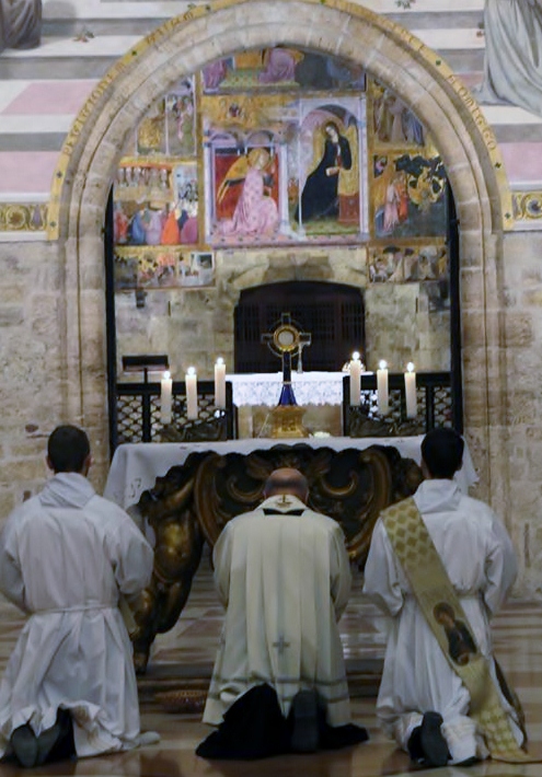 Prima di tutto, dove ci troviamo? Siamo a Santa Maria degli Angeli, ai piedi di Assisi, nella pianura, allora boscosa, dove una chiesetta abbandonata, detta Porziuncola, venne scelta da San Francesco come sede prediletta della prima comunità. E’ qui che Francesco fonda l’Ordine dei Frati Minori, è qui che Chiara riceve l’abito religioso, è qui che, per intuizione dello stesso Francesco, viene istituito il cosiddetto “Perdono di Assisi”, l’indulgenza plenaria che richiamerà alla Porziuncola, nei secoli, moltitudini di pellegrini. E’ qui, infine, che Francesco muore, nudo sulla nuda terra, la sera del 3 ottobre 1226.