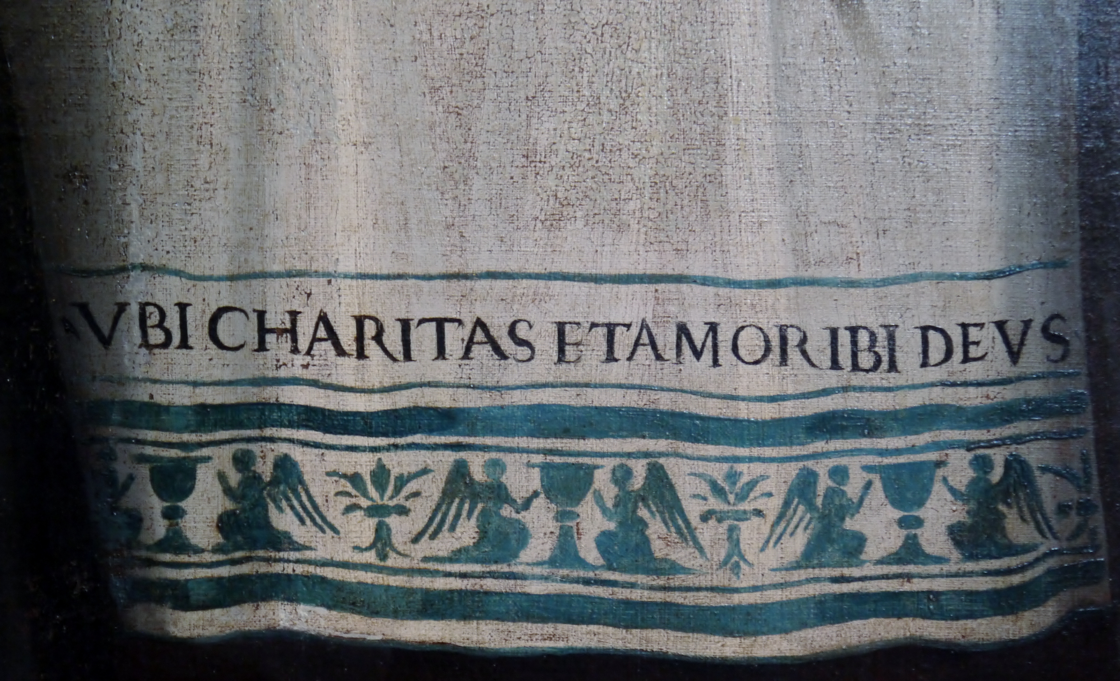 L’iscrizione latina Ubi charitas (più erudito dell’usuale caritas) è l’inizio dell’antico inno De Caritate di Paolino di Aquileia, cantato ancora oggi, legato all’ esposizione e adorazione del Sacramento e ai riti del Giovedì Santo (Messa in Cena Domini e Lavanda dei piedi). La tovaglia da altare, l’iscrizione latina e il ricamo figurato (calice e patena) sono riferimenti evidenti al culto eucaristico.