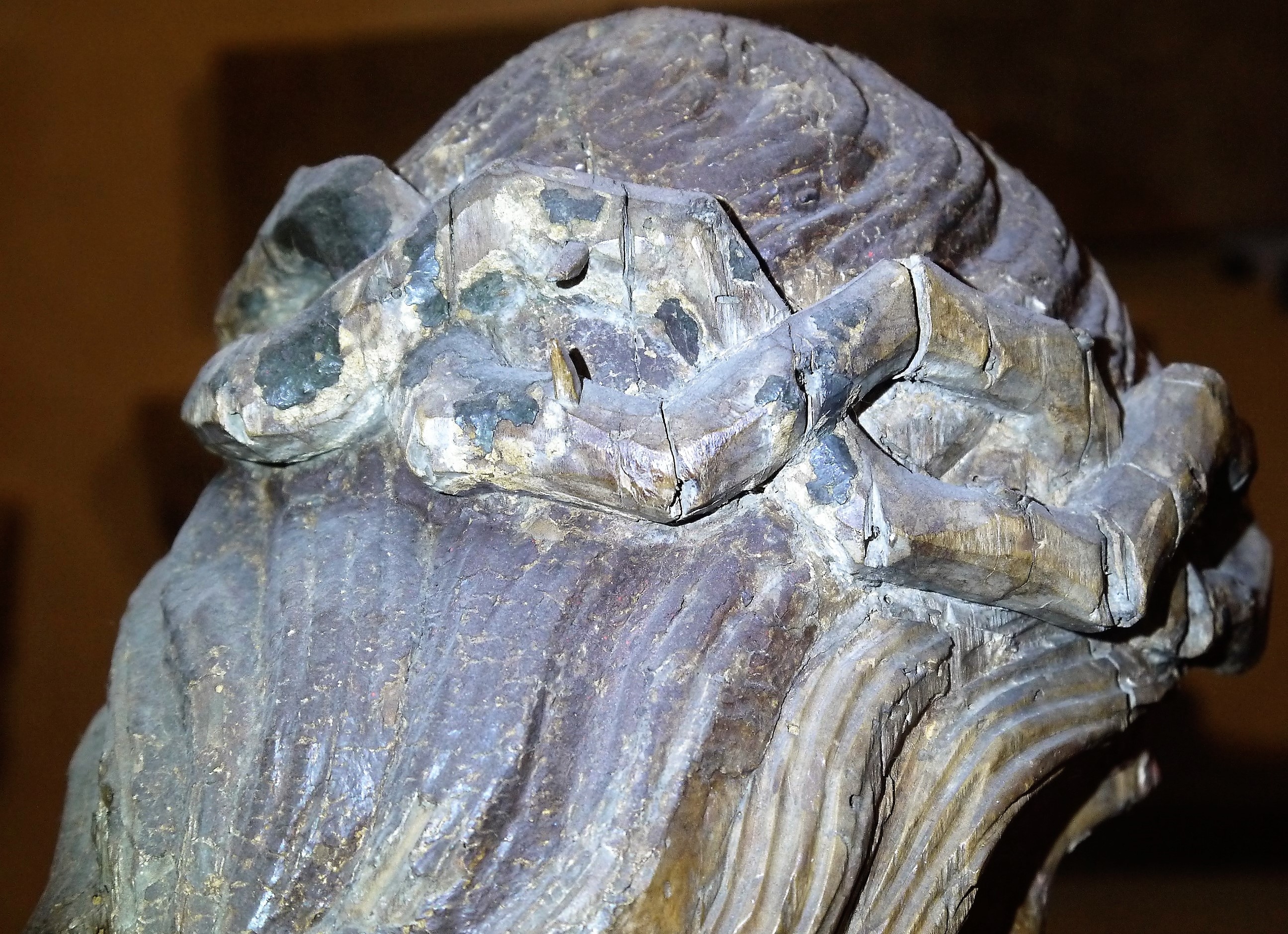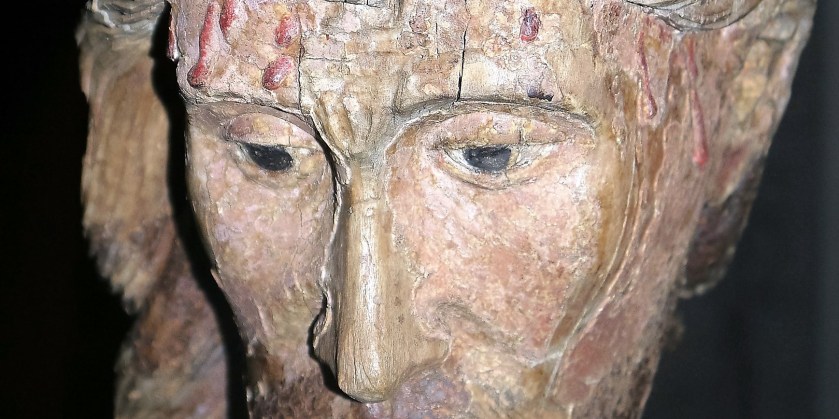 La testa presenta una folta e lunga capigliatura a spesse onde parallele che si estende anche sulla sommità del tronco. La corona di spine, massiccia, è formata da un intreccio regolare di rami, quasi geometrico. Le spine (ne rimangono due) erano inserite in una serie di fori tutt’intorno, ben visibili.