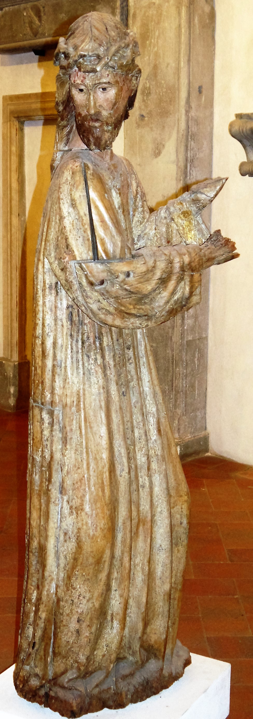 Resta, tuttavia, la difficoltà di interpretare un’opera di cui non si conoscono, ad oggi, coevi esempi in scultura, mentre l’iconografia del Cristo portacroce è ben attestata nelle scene di Salita al Calvario nella tradizione pittorica toscana soprattutto del Due-Trecento.