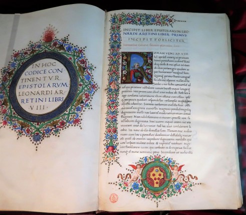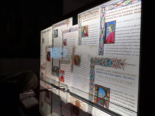 Si tratta della prima mostra in assoluto dedicata esclusivamente a Leonardo Bruni, curata dallo studioso Paolo Viti, a coronamento di un percorso che ha come tappe fondamentali il convegno fiorentino del 1987: “Leonardo Bruni: Cancelliere della Repubblica di Firenze” (a cura di P. Viti) e la mostra aretina del 2003: “I cancellieri aretini della Repubblica di Firenze” (a cura di R. Cardini e P. Viti), senza dimenticare la mostra del 2008 all’Archivio di Stato di Firenze: “Coluccio Salutati e Firenze. Ideologia e formazione dello Stato” (a cura di R. Cardini e P. Viti). Sebbene non sia stato ancora possibile pubblicare un catalogo (un rammarico per tutti gli organizzatori), la presenza di un dépliant gratuito, didascalie bilingui (italiano/inglese), alcuni video e un magnifico touch-screen (in cui è possibile “sfogliare” integralmente tre manoscritti) rendono la visita piacevole e istruttiva (con qualche pannello esplicativo in più sarebbe stata perfetta). Un’occasione da non perdere, per i cultori dell’Umanesimo, della storia e del bello.