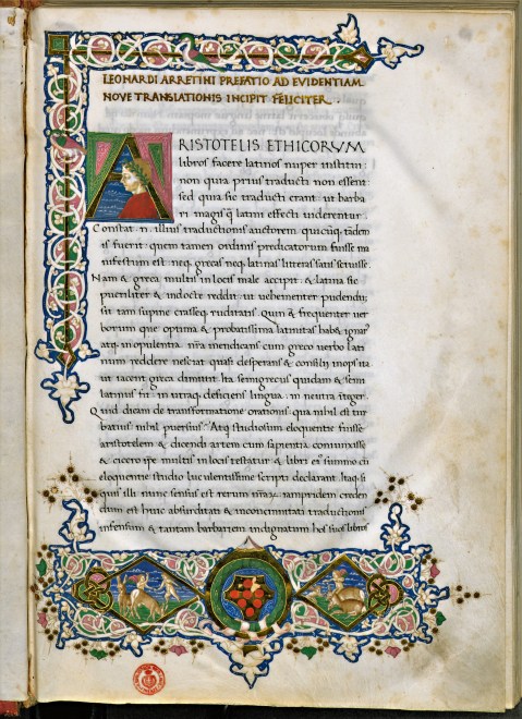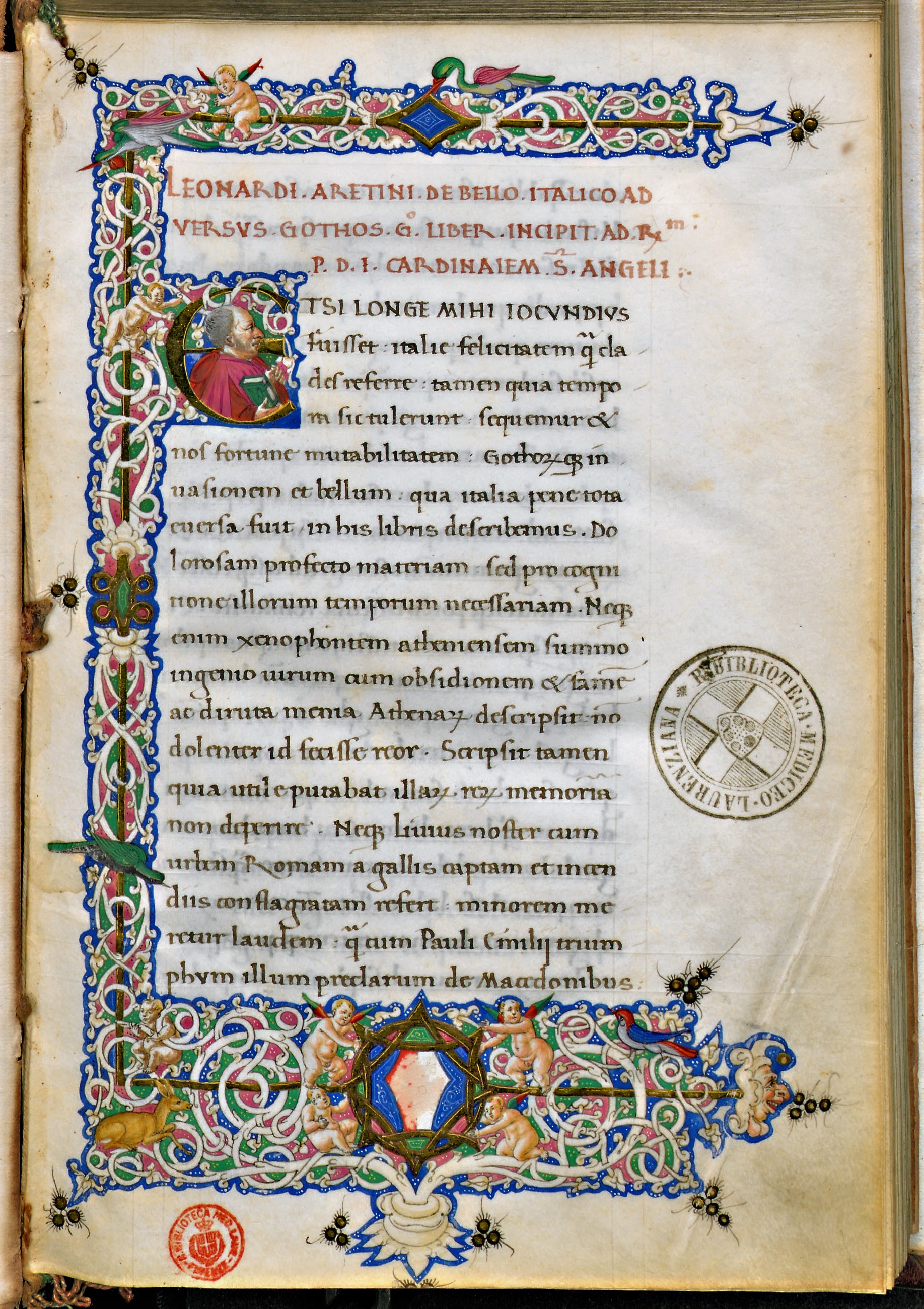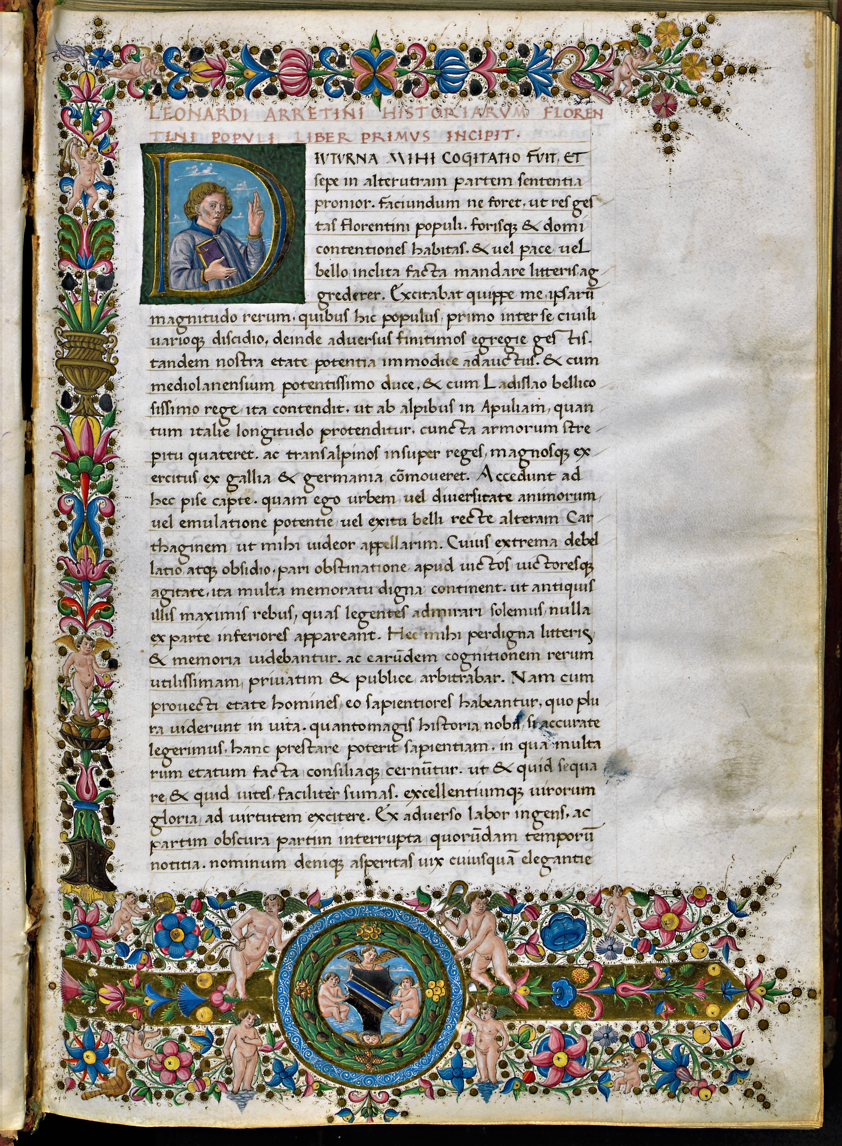 La prima pagina (carta 1 recto) è splendidamente decorata a foglia oro e colori da un miniatore di scuola fiorentina. Sul fondo della lettera iniziale D (“Diuturna mihi cogitatio fuit”) è una mezza figura di profilo che tiene un libro, identificata come Cosimo il Vecchio (Garzelli) o, più probabilmente, come Leonardo Bruni (Lazzi, D’Ancona), vestito con lucco rosso su veste rosa che, come il berretto, è foderata di ermellino. Attorno al berretto una corona di alloro. L’abito “da magistrato” e la corona dei letterati ben si addicono al ruolo del cancelliere Bruni.