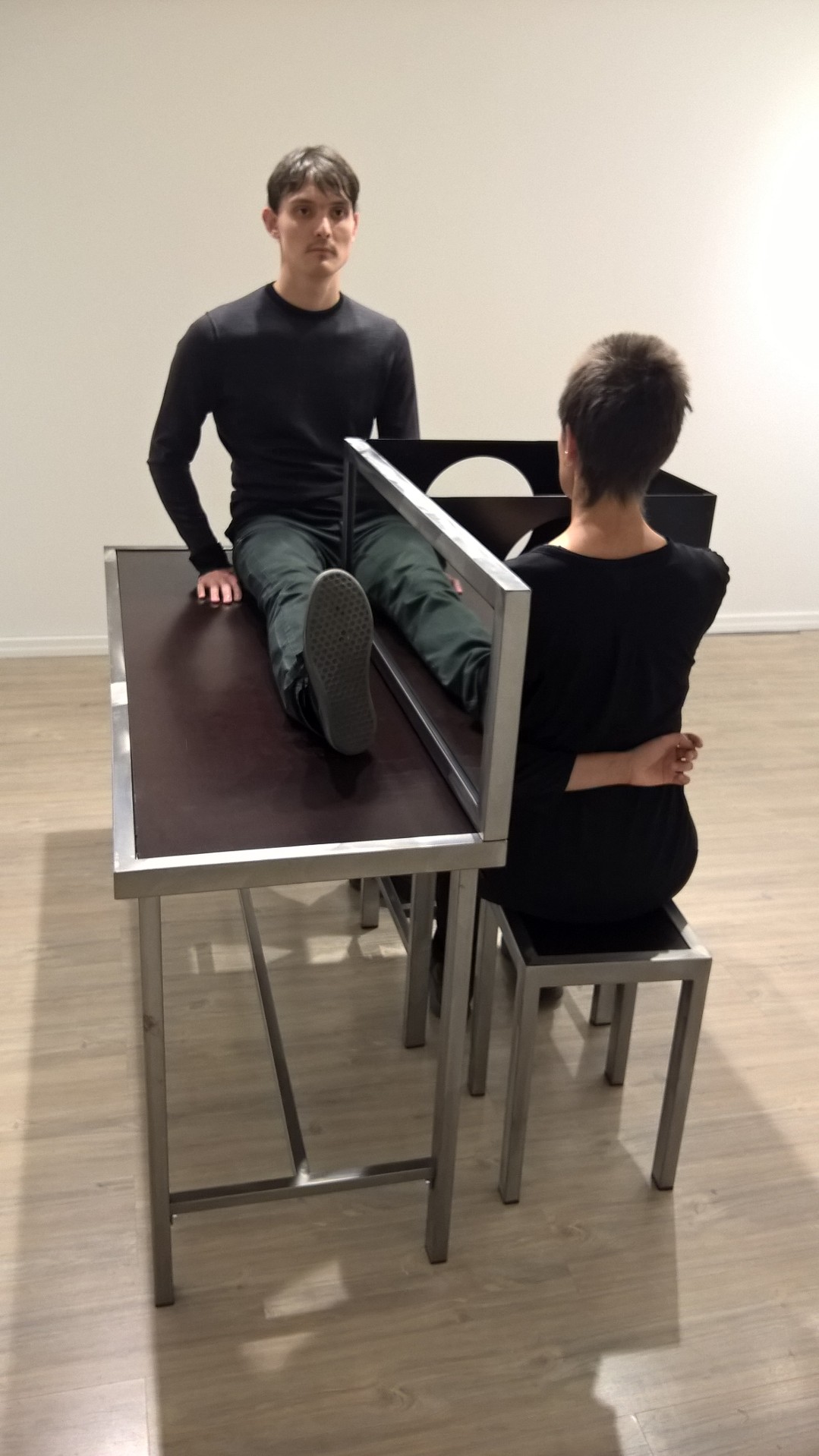 La Galleria milanese Officine dell’Immagine è particolarmente affollata il 26 ottobre 2017, giorno del vernissage. Gli organizzatori l’hanno fatto coincidere con l’inaugurazione della nuova sede della galleria in Via Carlo Vittadini 11. È prevista una performance in cui ci verrà mostrato l’uso dell’installazione Constructing Illusion (2014-2015), dove, come scrive Silvia Cirelli nel catalogo della mostra, siamo testimoni di un vero e proprio “trionfo dell’illusione”. Un’opera in cui «presenza e assenza», «equilibrio tra vuoti e pieni», raggiungono una sintesi stilistica e simbolica perfetta. Quando i due performer hanno terminato la loro dimostrazione (in cui seduti su uno strano marchingegno, attraverso due specchi, la gamba di uno e il braccio dell’altra, nascosti, ritrovavano il loro simmetrico arto mancante), approfittando di un momento in cui l’artista è solo, chiedo a Silvia Cirelli di presentarmelo. Il pubblico si è catapultato su un provvidenziale buffet allestito in un’altra sala. mounir fatmi comprende l’italiano anche se non lo parla bene, mi rassicura Silvia. In ogni caso lei si offre di farmi da interprete, qualora avessi qualche difficoltà con il francese e l’inglese.