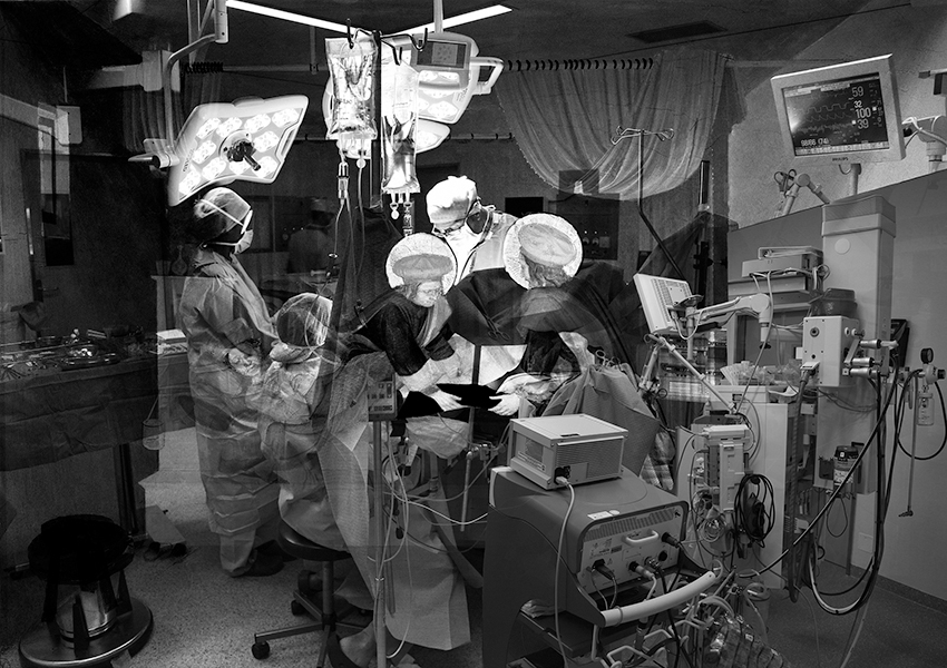 L’opera che maggiormente colpisce l’attenzione del visitatore è la serie di foto in bianco e nero di The Blinding Light (2013): rappresentazioni di cinque sale operatorie di ospedali europei in cui, mescolati alle équipe mediche, riconosciamo i Santi Cosma e Damiano che trapiantano la gamba di un moro al diacono Giustiniano, nella versione dipinta dall’Angelico per la predella della Pala di San Marco (1438-1443). Si tratta di manipolazioni visive e concettuali. Le figure fantasmatiche dei due santi, galleggianti sulle loro nuvolette traslucide, sono perfettamente integrate alle scene ospedaliere. Il curioso miracolo dipinto dall’Angelico è narrato all’interno della Leggenda aurea di Jacopo da Varagine, nelle storie di Cosma e Damiano, e ha avuto una certa diffusione fino al Concilio di Trento. A Firenze il culto dei due santi dottori è legato al patronato mediceo; per l’associazione etimologica con il loro nome, ma più probabilmente perché i Medici pretendevano di avocare a sé la “cura” dei problemi dei loro sudditi.