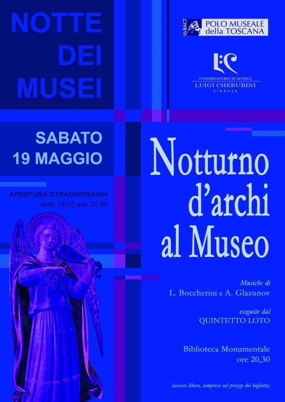 Alle ore 20.30, nella Biblioteca monumentale del museo si terrà il concerto Notturno d’archi, a cura del Conservatorio di Musica “Luigi Cherubini” di Firenze – Istituto di Alta Formazione Musicale.