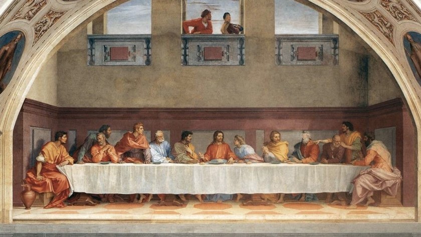 Andrea del Sarto, che si ispirò al famoso Cenacolo di Leonardo da Vinci a Milano, coglie gli apostoli nel momento in cui ricevono l’annuncio del tradimento da Gesù e aggiunge nella parte superiore una piccola e originale scena di due personaggi affacciati a una terrazza che assistono all’evento. I disegni preparatori per le figure indicano il lungo studio preliminare a questa pittura così grandiosa e vibrante dalla comunicativa immediata, così ricca di sfumature preziose rese con eccezionale maestria nella tecnica veloce dell’affresco. Secondo il racconto riferito da Benedetto Varchi, vent’anni più vecchio, la bellezza dell’affresco salvò quella parte del convento dalla rovina ordinata dalla Repubblica fiorentina perché gli edifici fuori le mura non offrissero riparo all’esercito di Carlo V, inviato ad assediare Firenze nel 1529. Al 1511 risale la decorazione del sottarco della volta, alla quale collaborarono per le grottesche Andrea di Cosimo Feltrini e, probabilmente, il Franciabigio. Vi sono raffigurati San Giovanni Gualberto, San Salvi, la Trinità (al centro), San Bernardino degli Uberti e San Benedetto.