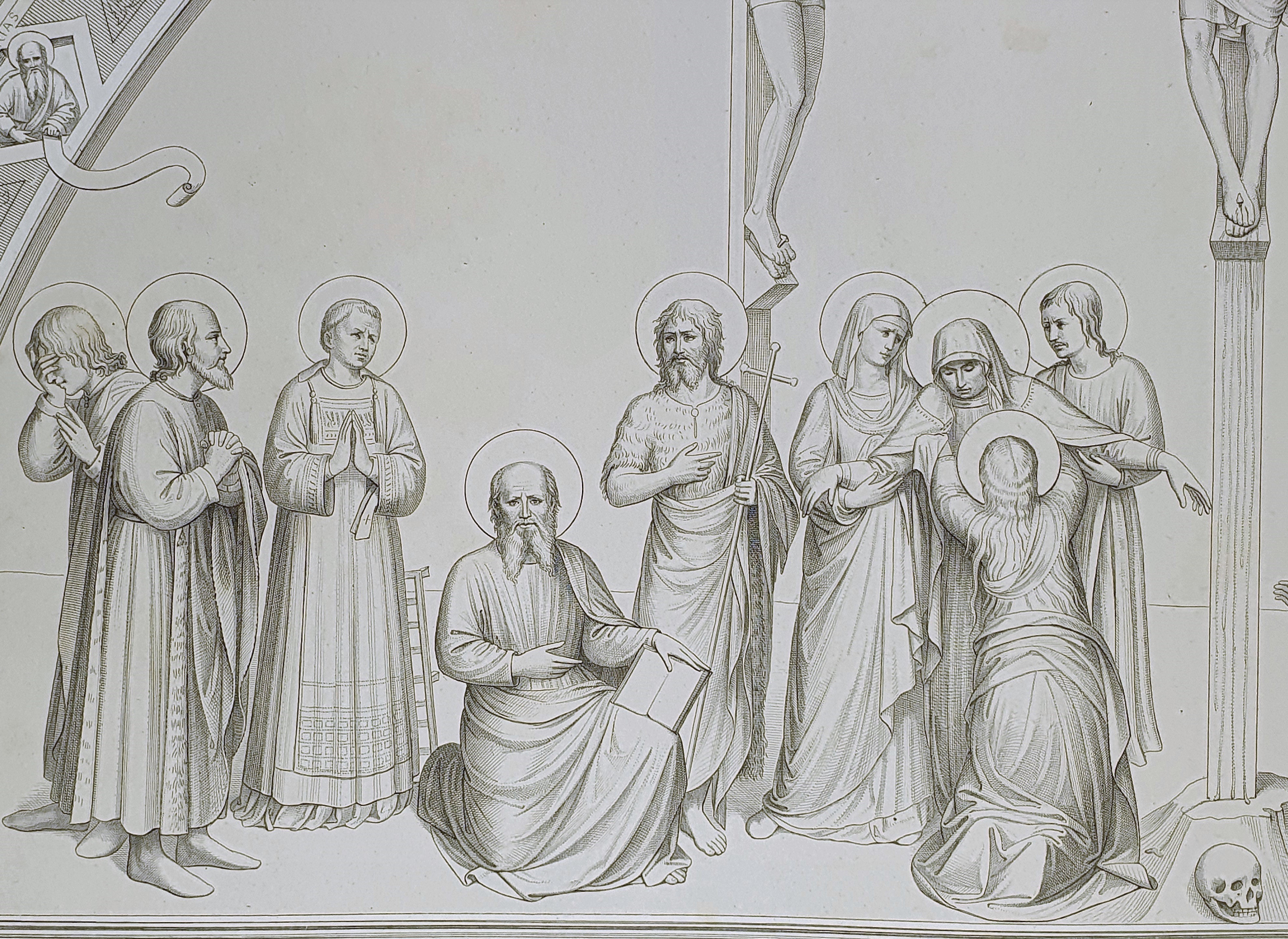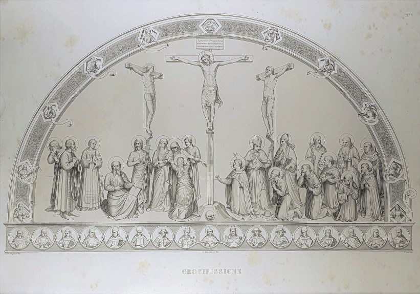 Nel Capitolo di cui si ragiona pose nel mezzo, sollevato in alto sulla croce Gesù Cristo, e a destra ed a sinistra i due ladroni; dappiedi schierò dall’una e dall’altra parte gran moltitudine di santi. Nella figura del Redentore si ammira una rara nobiltà di forme. Il nudo è tuttavia alquanto giottesco; non pertanto (tuttavia) mi offende assai meno delle forme soverchiamente carnose dei cinquecentisti, non eccettuato Fra Bartolomeo della Porta. Inferiori sono i nudi dei due ladroni; ma nel volto dell’uno si legge tutta la gioia di un sicuro perdono, nell’altro vedi improntata la bestemmia e la disperazione di chi già assapora l’inferno.