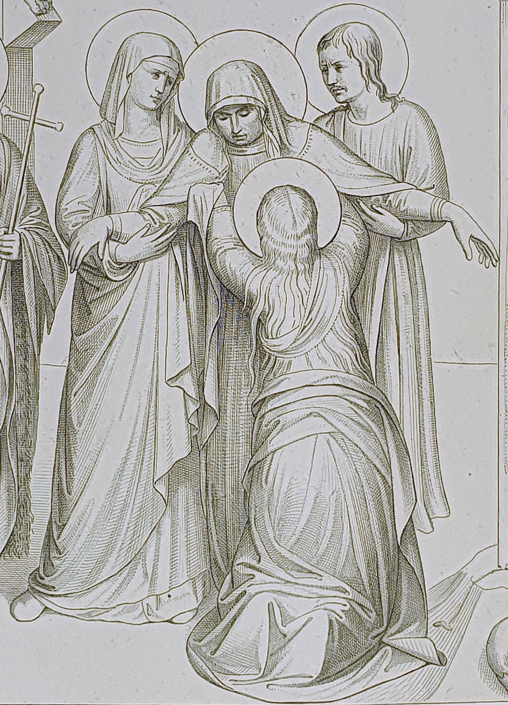 Dappiedi a destra (alla destra di Cristo, ma a sinistra per chi guarda) pose svenuta la Madre, sorretta da San Giovanni e da una delle pie femmine. La Maddalena con slancio affettuoso ed animato si protende ad aiutarla, e la si stringe fra le braccia. Gruppo di tanta bellezza ed efficacia, che cava dagli occhi le lagrime, e che non cede (non è inferiore) a quello onde il Razzi (errato per Bazzi) ritrasse lo svenimento di Santa Caterina da Siena (l’affresco di Giovanni Antonio Bazzi, detto il Sodoma, nella cappella di Santa Caterina in San Domenico, a Siena).