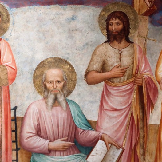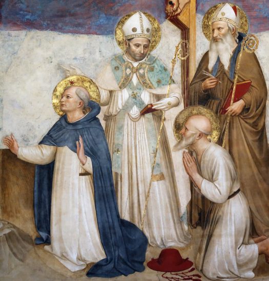 È primo San Domenico, prostrato appiè della croce, e levato in altissima contemplazione, figura disegnata e colorita eccellentemente. Seguita San Zanobi vescovo di Firenze, o forse meglio Sant’Ambrogio arcivescovo di Milano, il quale medita sulle sacre carte i vaticini dei Profeti avverati nel Redentore, che egli accenna col dito. Quel vecchio calvo, con bianca barba, scarno e logoro dagli anni e dal digiuno, è il magno Gerolamo, nel cui petto l’amor della croce attutì le gagliarde passioni, e sembra che tuttavia chieda forza ed aiuto nella durissima tenzone (battaglia spirituale). Viene poscia Sant’Agostino, il quale medita e scrive.