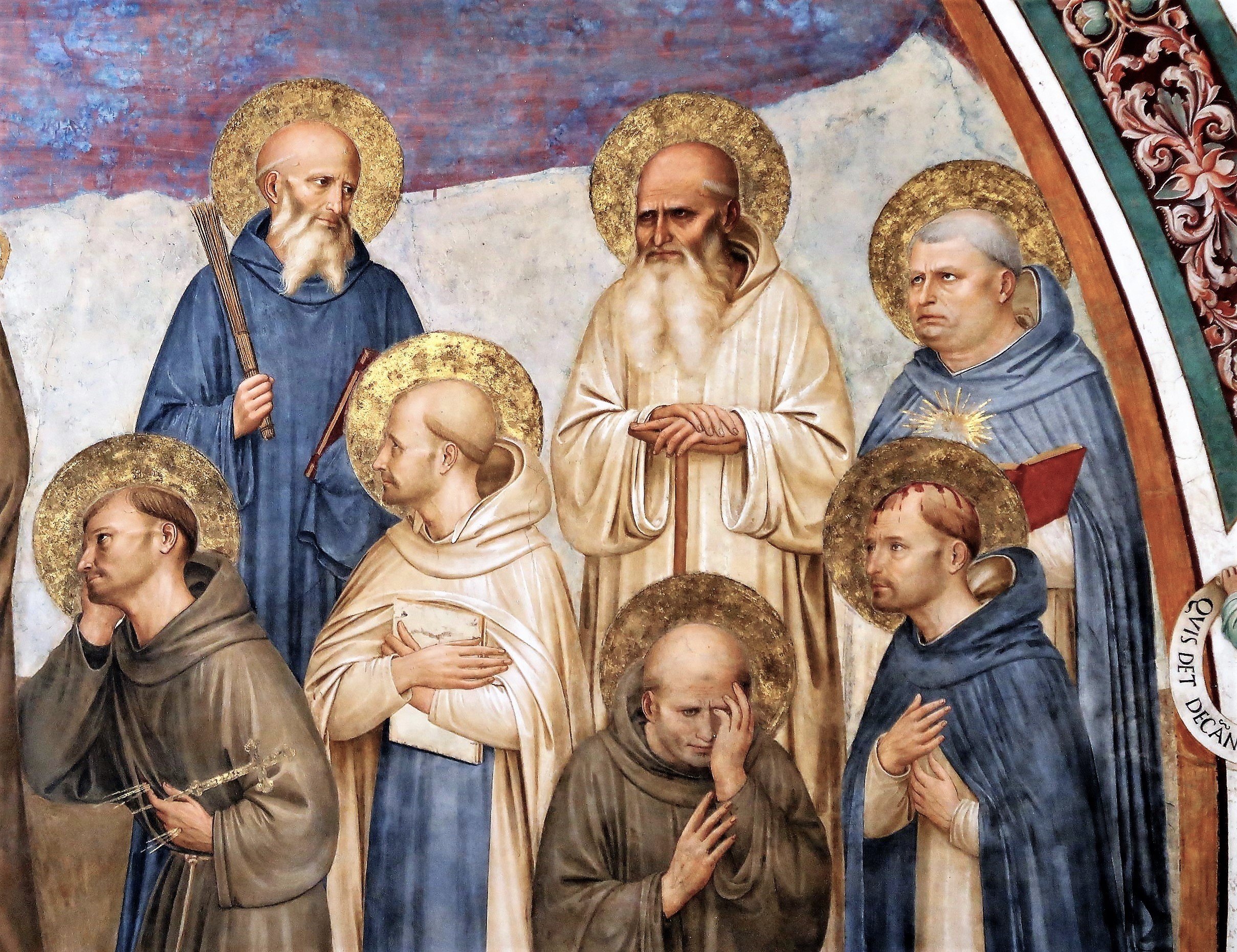 A mano manca (alla sinistra di Cristo, ma a destra per chi guarda) si apre una scena non meno tenera ed affettuosa. Sono undici Santi, la più parte fondatori di Ordini religiosi, i quali sembrano meditare la passione di Cristo. E forse fu intendimento del pittore mostrare in essi più copioso il frutto della redenzione; e come il Capitolo dovea servire all’uso di ammonire, correggere, infervorare i religiosi nella disciplina claustrale, volle presentare ai medesimi (i frati) dei grandi modelli da imitare.