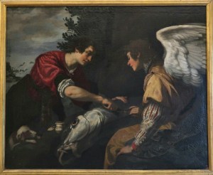 Il secondo dipinto è di Jacopo Vignali (1592 – 1664), visibile nel corridoio tra i due chiostri maggiori, con Tobiolo e l’Angelo e l’immancabile cagnolino in una scena agreste, con il ragazzo colto nell’atto di aprire il pesce con un coltello per estrarne il medicamento.