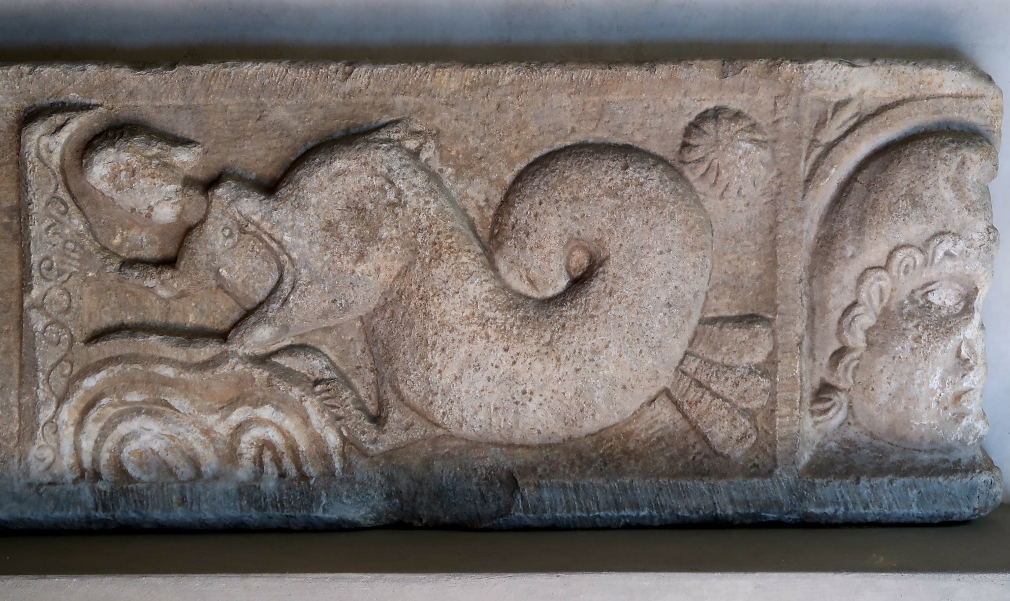 L’ultima creatura marina di questa passeggiata la incontriamo lungo il corridoio della Foresteria che conduce all’uscita, nella seconda sala del Museo di Firenze Antica, in cui sono esposti reperti di diversa provenienza. Sulla parete a sinistra, si nota il frammento di un sarcofago in marmo risalente verosimilmente al V secolo d. C., anche se con parziali rifacimenti trecenteschi. Proveniente dal convento di San Pancrazio, dove fungeva da sepolcro di un membro della famiglia Temperani, è giunto a San Marco nel 1915, dopo un secolo di permanenza al Bargello.