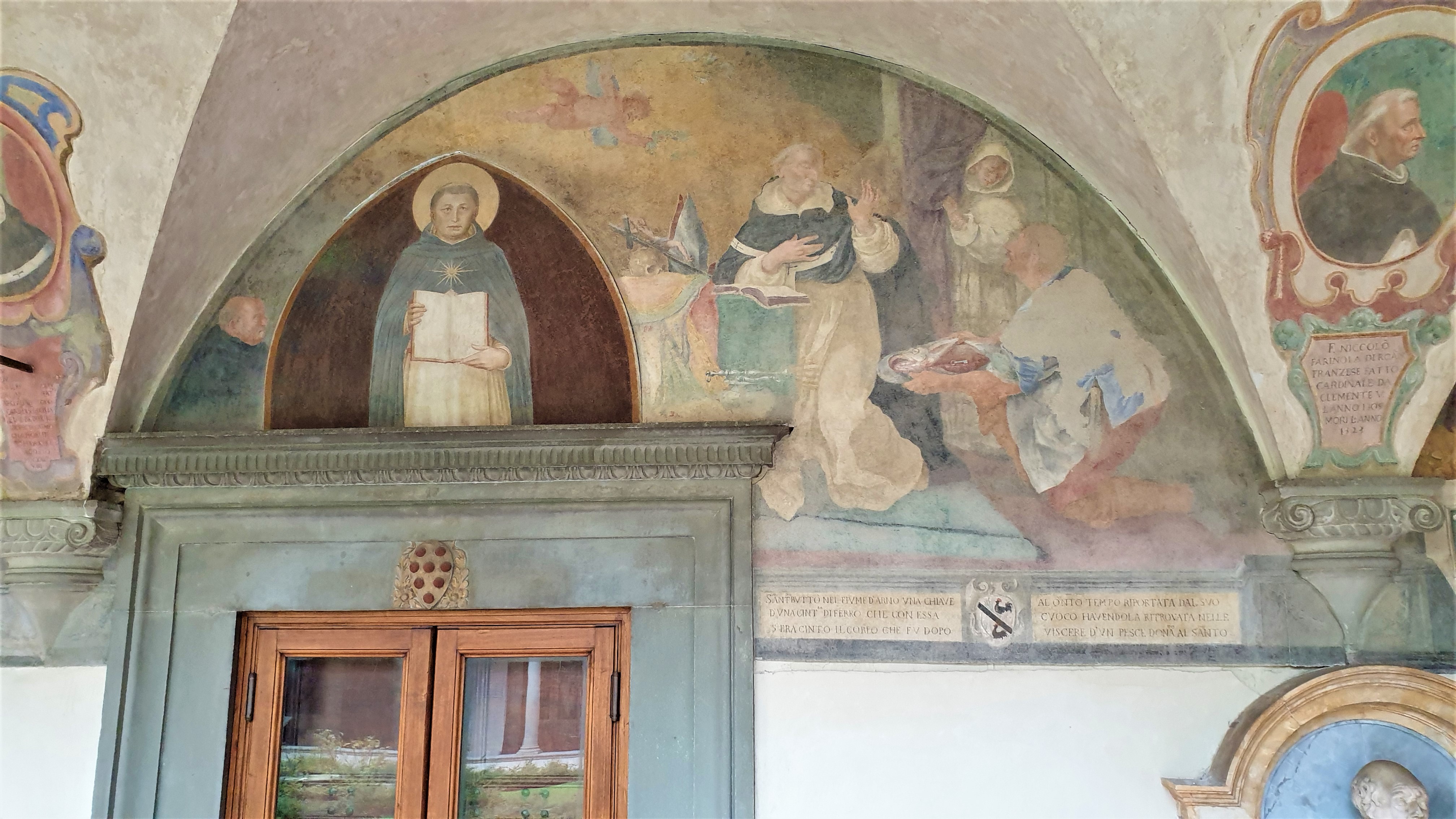 La prima immagine di pesce che incontriamo nel nostro itinerario, si trova nel Chiostro di Sant’Antonino, accanto all’ingresso del Museo, subito a destra, sulla porta che dà accesso alla nuova Sala del Beato Angelico. Si tratta di una delle lunette affrescate nel Seicento, con le scene della vita e dei miracoli del Santo priore di San Marco e arcivescovo di Firenze. Diversi artisti hanno contribuito al completamento del ciclo e la loro opera veniva sovvenzionata, di volta in volta, con le offerte lasciate ai frati dalle famiglie che intendevano seppellire i loro cari nel chiostro del Convento. A questa impresa attesero, tra gli altri, Bernardino Poccetti, Alessandro Tiarini, Cecco Bravo, Giovan Battista Vanni.