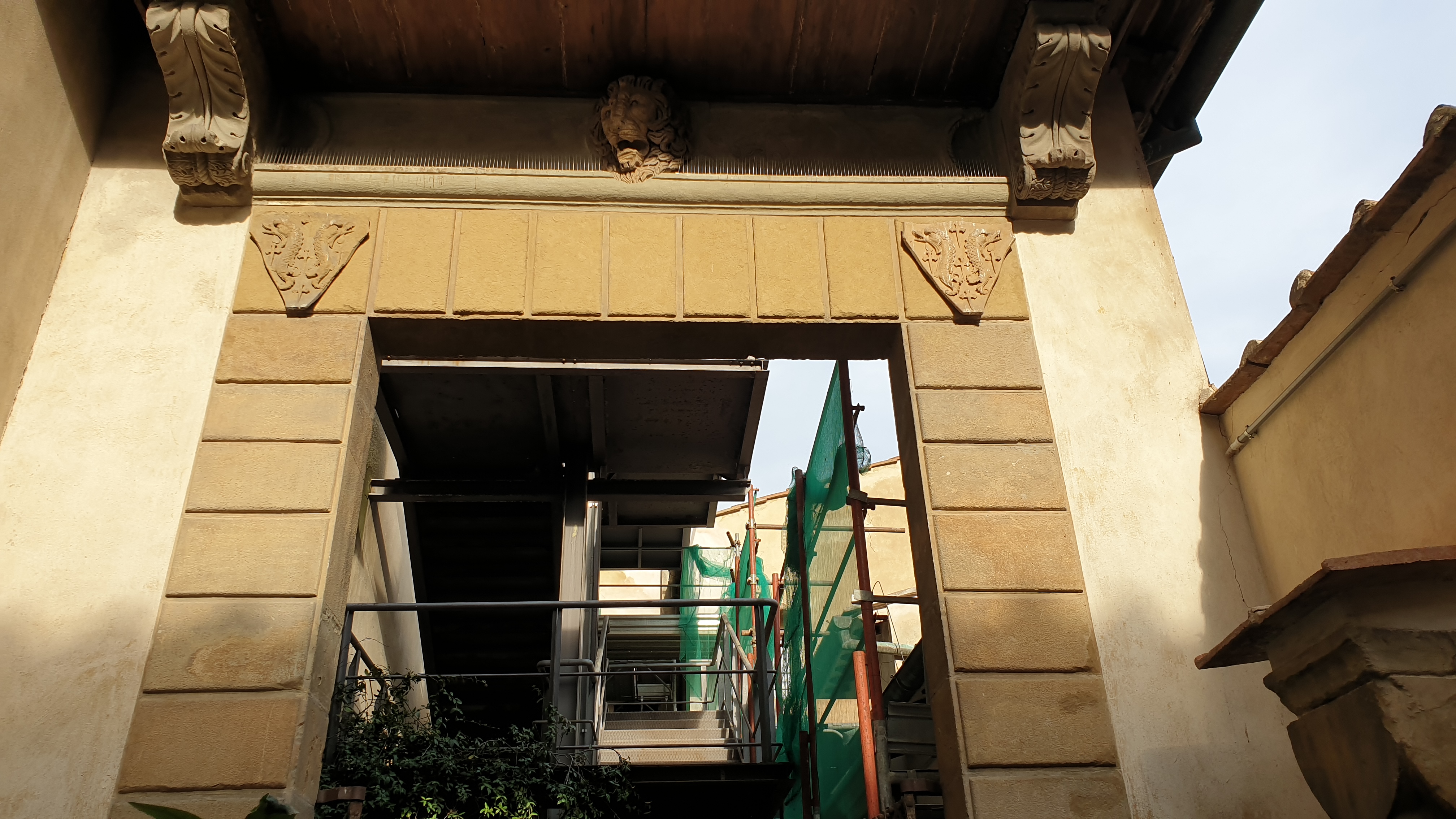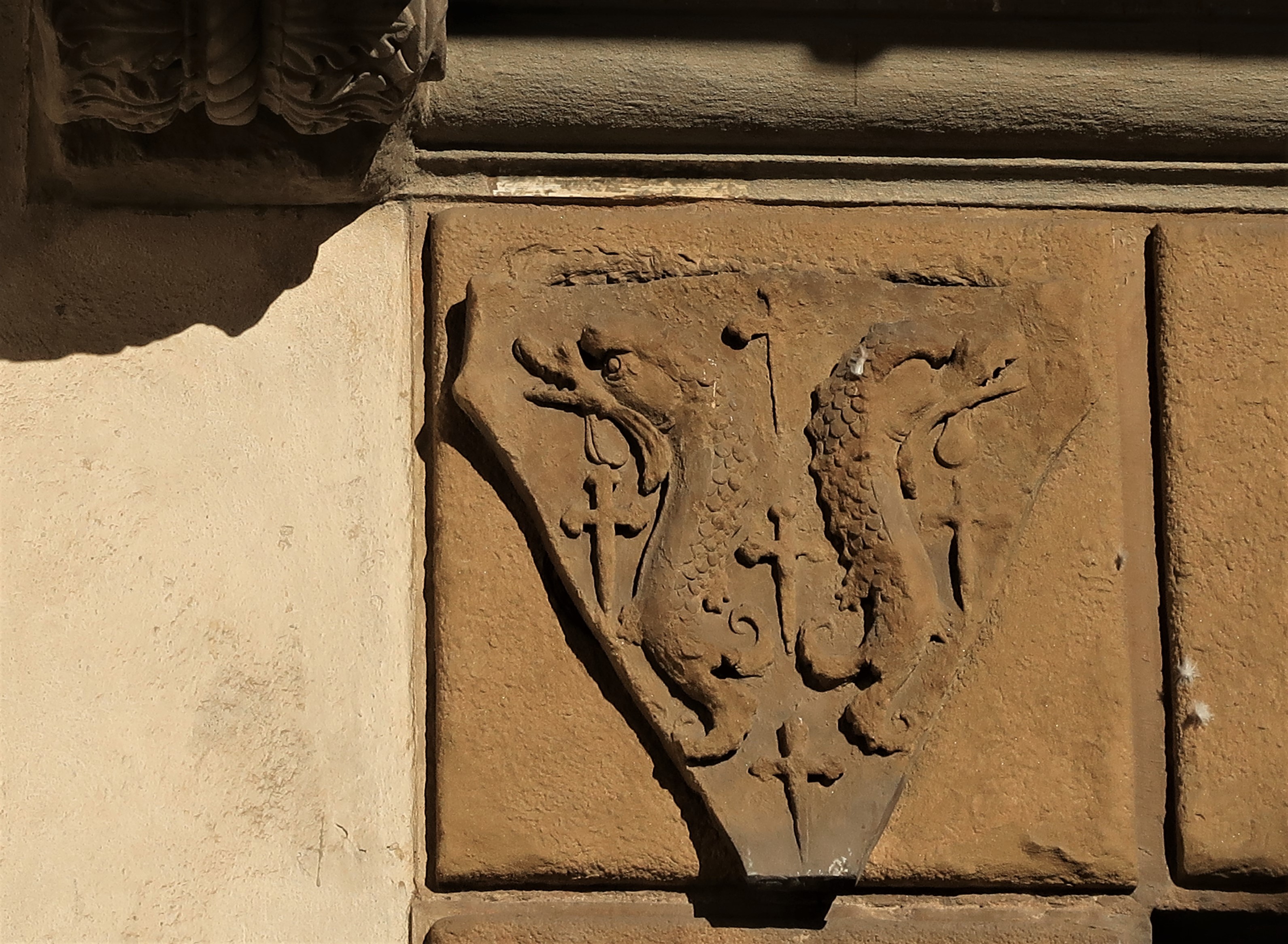 Dirigendoci nella zona dell’antico Convento dove un tempo si depositavano le masserizie, possiamo fare un’altra interessante scoperta marina. In fondo alla Corte del Granaio, dopo il Chiostro dei Silvestrini, attualmente chiuso al pubblico, troviamo il Portale attribuito da Milanesi e Carocci a Donatello, un tempo situato in Via dell’Oriuolo e da cui si accedeva al giardino dei Pazzi. Se si osserva l’architrave, si riconoscono, ai lati, gli scudi triangolari dello stemma della famiglia Pazzi, con due delfini e cinque crocette trifogliate. Risalente alla prima metà del XV secolo, il portale fu demolito tra il 1865-69 per costruire la Banca d’Italia, trasportato al Bargello e successivamente ricomposto nel Museo di San Marco. Lo stemma è uno dei tanti esempi dell’uso, in araldica, dei delfini, messaggeri degli dei, presenti a Firenze anche nell’arme della famiglia Pandolfini.
