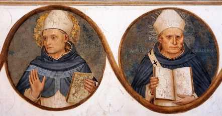 I Santi hanno l’aureola; i Beati, i raggi in oro. Non abbisogna molta critica per tosto ravvisare (accorgersi subito) che il nome di Sant’Antonino dee (deve) esservi stato aggiunto posteriormente. Perciocchè (perché), omesso che i lineamenti di questo ritratto non rispondono in guisa alcuna (in alcun modo) agli altri che abbiamo verissimi di lui, non poteva l’Angelico ritrarre il Santo arcivescovo con l’aureola intorno il capo e con le divise pastorali quando il medesimo era tuttavia vivente, e semplice religioso del suo Convento di San Marco. Se non che sotto il nome di Sant’Antonino si vede trasparire un altro diverso e più antico nome (probabilmente Aldobrandino Cavalcanti, priore di Santa Maria Novella e vescovo di Orvieto). Potrebbesi (si potrebbe) dubitare eziandio (anche) di quelli di San Vincenzo Ferreri e del Beato Giovanni Dominici; o credersi che l’aureola del primo e i raggi del secondo fossero stati aggiunti nei tempi posteriori. Questi ritratti sono assai belli, ma assaissimo danneggiati e segnatamente negli occhi.