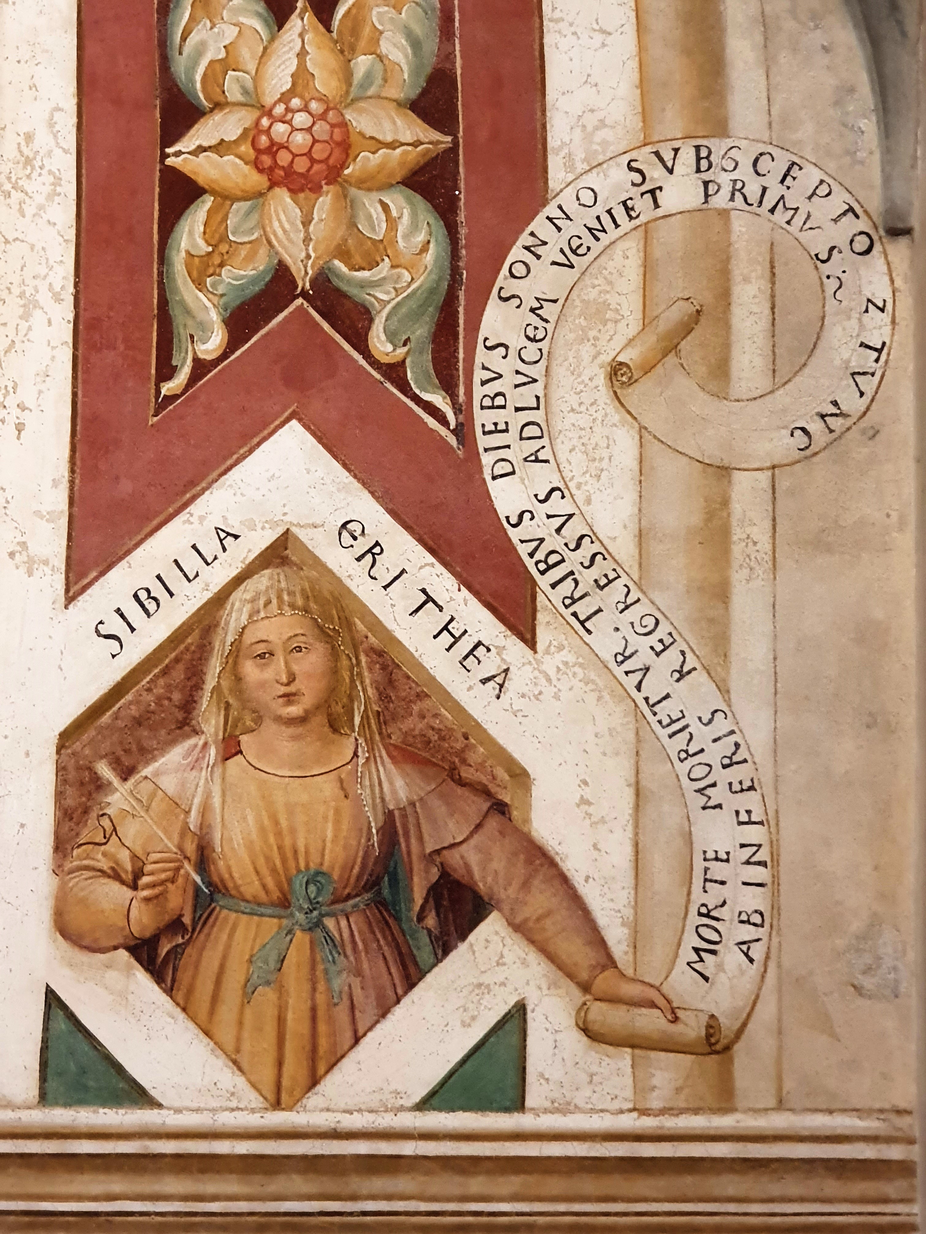 A meglio significare questa sua devota meditazione il pittore fece in dieci esagoni, che circondano l’arco della volta, dieci figure protome, o vogliam dire mezze figure, di Profeti e di Sibille, le quali tengono alcuni cartelli con motti riguardanti la passione di Gesù Cristo; e sono quanto mai possa dirsi belle e graziose.
