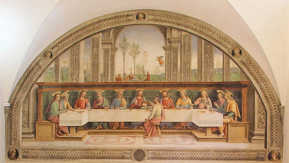 L’apertura verso uno sfondo ricco di dettagli naturalistici dalla valenza chiaramente simbolica nel cenacolo di Ghirlandaio, si va allargando verso un vero e proprio paesaggio, nello sfondo de L’ultima Cena che Perugino dipinse alla fine del ‘400, nel refettorio del convento delle terziarie francescane di Foligno, che si erano insediate presso il convento di Sant’Onofrio. Circa quindici anni separano questo grande affresco dai due precedenti omologhi di Ognissanti e San Marco, ma osserviamo che la scena è attraversata da un respiro molto più ampio di movimenti e sentimenti. Gli apostoli sembrano disporsi più liberamente nello spazio, con gesti meno trattenuti. La luce chiara, che inonda la tavola e le figure, è naturale, e sembra provenire direttamente dal paesaggio retrostante, incorniciato prospetticamente da un porticato in pietra finemente lavorato a grottesche. Piccole figure del Cristo orante e degli apostoli addormentati appaiono sullo sfondo, mentre a destra, sull’azzurrata lontananza della collina, si staglia la figura di un angelo in volo, recante il calice, connotando di iconografia evangelica questo particolare scorcio di natura caratterizzato da alcuni diafani alberi.