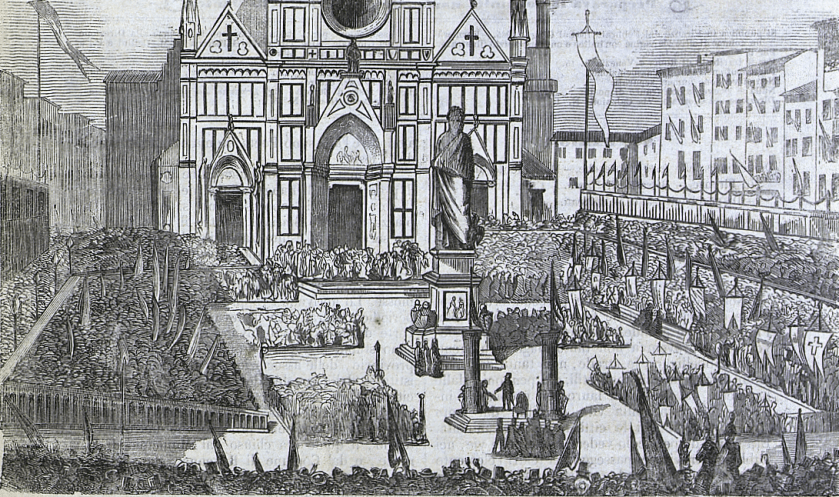 Quattro anni prima si erano concluse le celebrazioni per i seicento anni dalla nascita di Dante Alighieri, culminate il 14 maggio 1865 nell’inaugurazione in piazza Santa Croce del monumento al poeta scolpito da Enrico Pazzi, alla presenza di Vittorio Emanuele II, primo Re d’Italia.