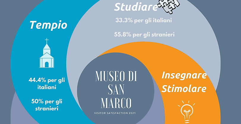 Nonostante alcune discrepanze rilevate dall’analisi comparativa, vale la pena sottolineare come il livello di gradimento dei visitatori non sia cambiato nel corso degli ultimi anni, nonostante l’imperversare della pandemia. Entrambe le indagini statistiche (2018 e 2021) evidenziano un livello di soddisfazione generale molto positivo, premiando soprattutto la professionalità del personale e la ricchezza delle collezioni. La maggioranza dei rispondenti del sondaggio ministeriale del 2021 ha dichiarato che avrebbe piacere di ritornare al museo. Tra le principali motivazioni del pubblico a visitare il Museo di San Marco vi è l’interesse per le collezioni e, più in generale, per l’esperienza estetica (“per vedere oggetti belli” 55.5% dei visitatori italiani, 88% dei visitatori stranieri) nonché la necessità di ampliare le proprie conoscenze (“per imparare cose nuove” 66.6% dei visitatori italiani e 50% dei visitatori stranieri).