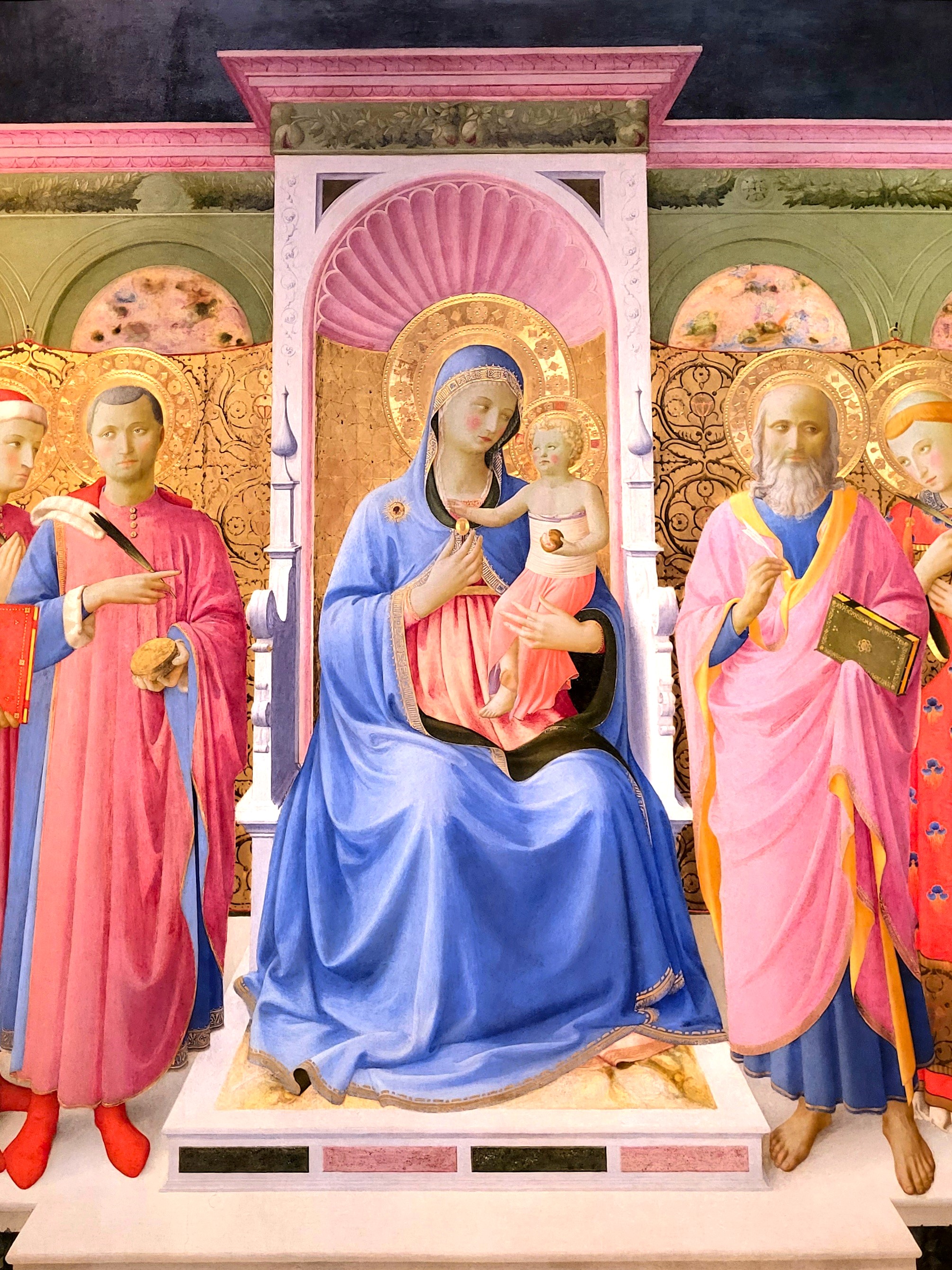 Al suo interno, la visita al Museo San Marco occupa, ovviamente, una posizione centrale. Nell’intento di seguire, passo passo, i versi del Fra Beato Andželiko di Gumilëv come una mappa poetica, Centomo presuppone che le opere su tavola dell’artista viste dal poeta fossero già a San Marco all’epoca della sua visita nel 1912. In realtà vi arrivarono solo negli anni Venti del Novecento, quando furono radunate nella sala che sarebbe diventata una vera e propria pinacoteca angelichiana sotto la direzione di Giovanni Poggi (1880 – 1961). Verosimilmente Gumilëv le avrà viste quando erano ancora sparse tra Galleria dell’Accademia, Galleria degli Uffizi e Galleria di Arte Moderna, dove erano state sistemate dopo le soppressioni napoleoniche del 1808 e quelle post-unitarie del 1866. A San Marco il poeta avrà visto il ciclo di affreschi del Dormitorio, e forse il bambino cui allude nei versi «Maria sorregge il Figlio/Riccioluto e con un nobile rossore/Bambini come questo la notte di Natale/Forse abitano i sogni di donne sterili», potrebbe essere quello della Madonna delle Ombre, più che quello della Pala di Annalena, come ipotizza Centomo.