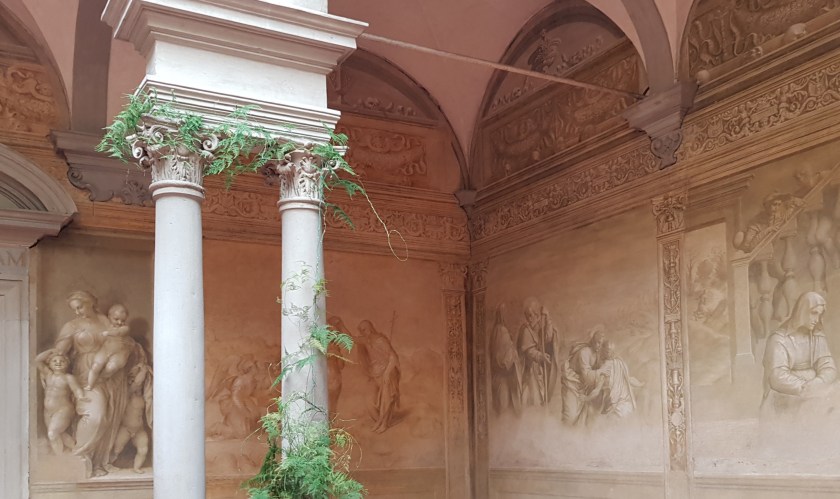 Il Chiostro dello Scalzo, piccolo fiore all’occhiello della Direzione Regionale Musei della Toscana, si trova in via Cavour 69, a pochi passi dal Museo di San Marco. La sua graziosa facciata graffita a finta pietra, restaurata da poco, è incastonata all’estremità dell’antico Casino Mediceo di San Marco, nel Palazzo Buontalenti. Sopra il portale di ingresso è visibile la lunetta in terracotta invetriata, attribuita a Giovanni della Robbia, che raffigura San Giovanni Battista in campo azzurro con la pelliccia di cammello e la croce d’oro, affiancato da due confratelli della compagnia con il cilicio in mano e con la tunica nera indossata durante le celebrazioni religiose.