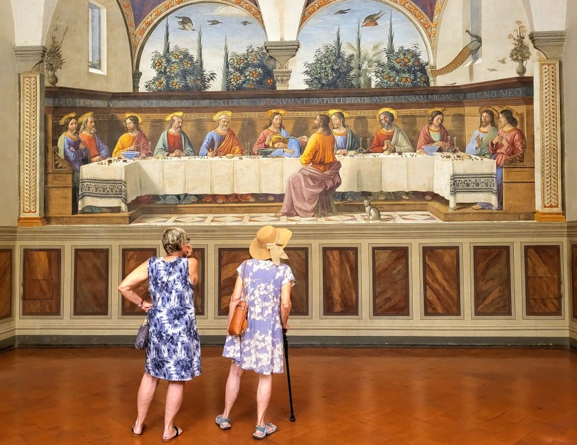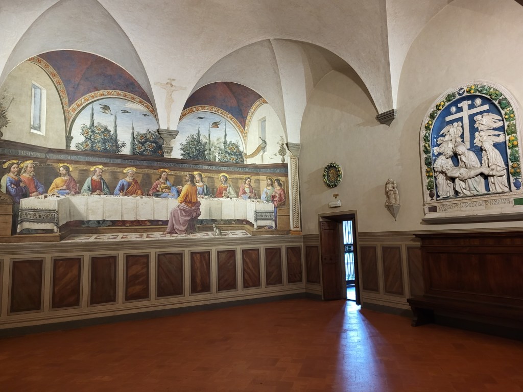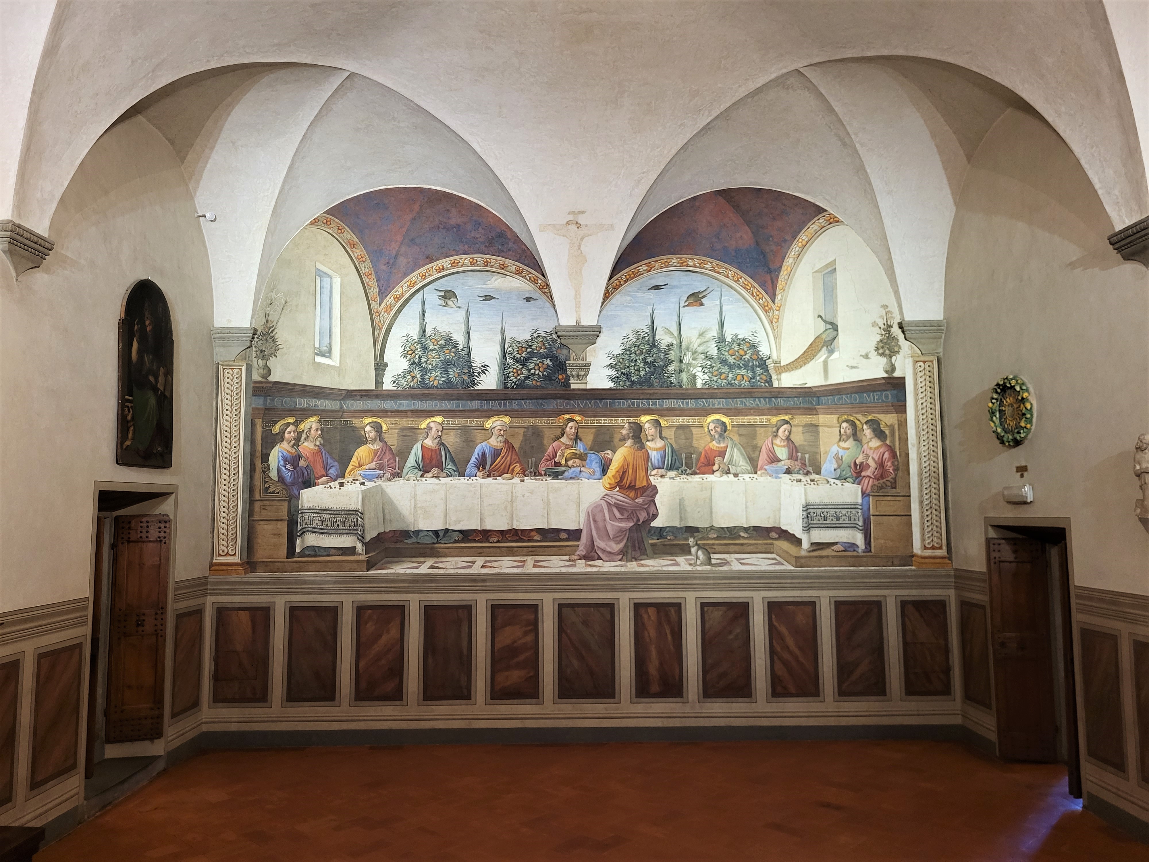Il vasto ambiente del refettorio è stato completamente riallestito e finalmente restituito, dopo più di vent’anni, alla sua principale funzione museale, e ora può essere nuovamente considerato tra le sale più attrattive del complesso di San Marco. Grazie alla nuova illuminazione e alla possibilità di osservarlo dalla giusta distanza, il grande affresco (400×810 cm) si offre allo sguardo dei visitatori in tutto il suo splendore prospettico, nei colori brillanti delle vesti degli apostoli, nell’affascinante simbologia ornitologica e arborea che appare sullo sfondo, nella precisione fiamminga dei brani di natura morta, come le ciliegie sparse sulla tavola, le sottili bottiglie di vetro trasparente e le pieghe della tovaglia con ricami di tradizione umbra sul lato minore del tessuto.