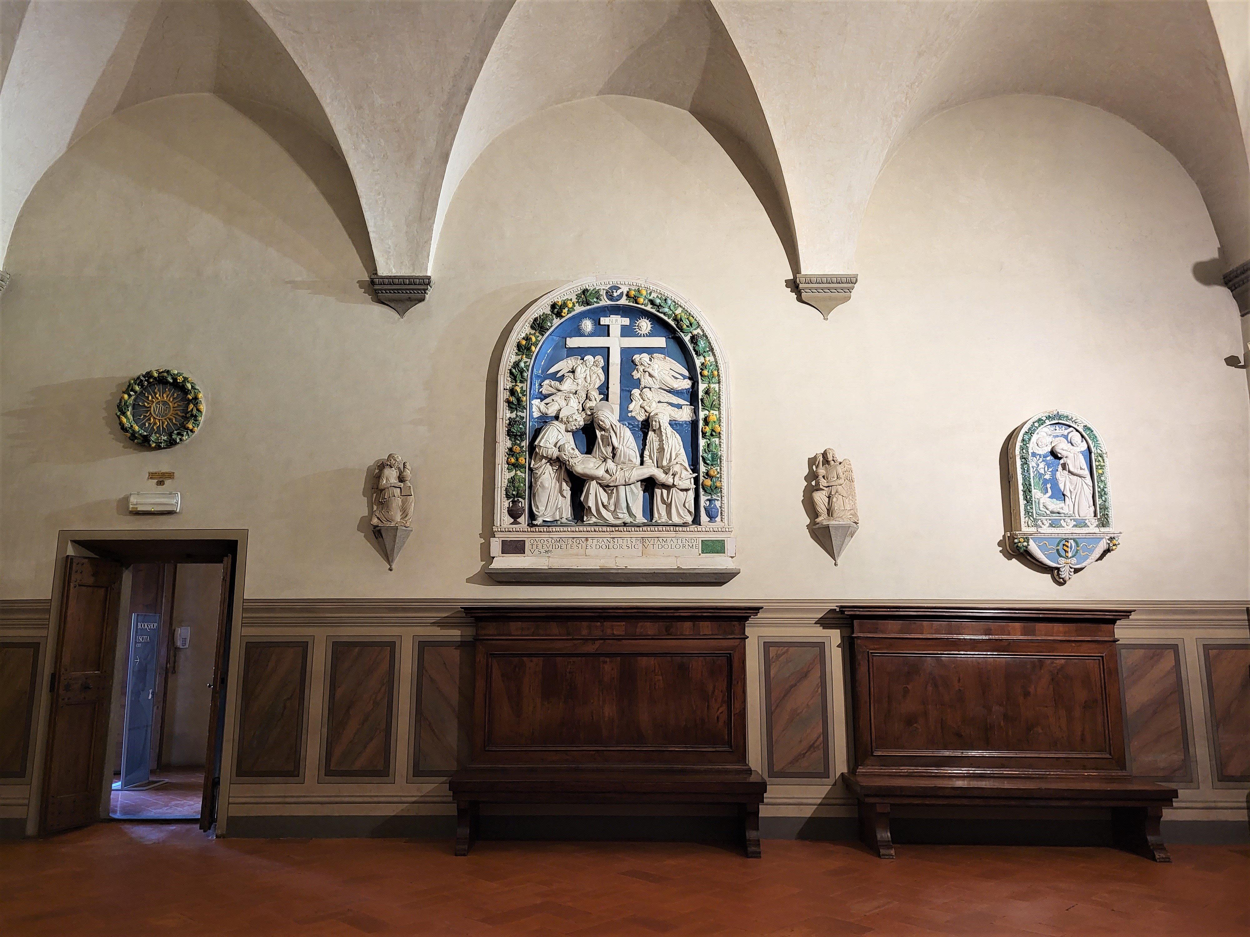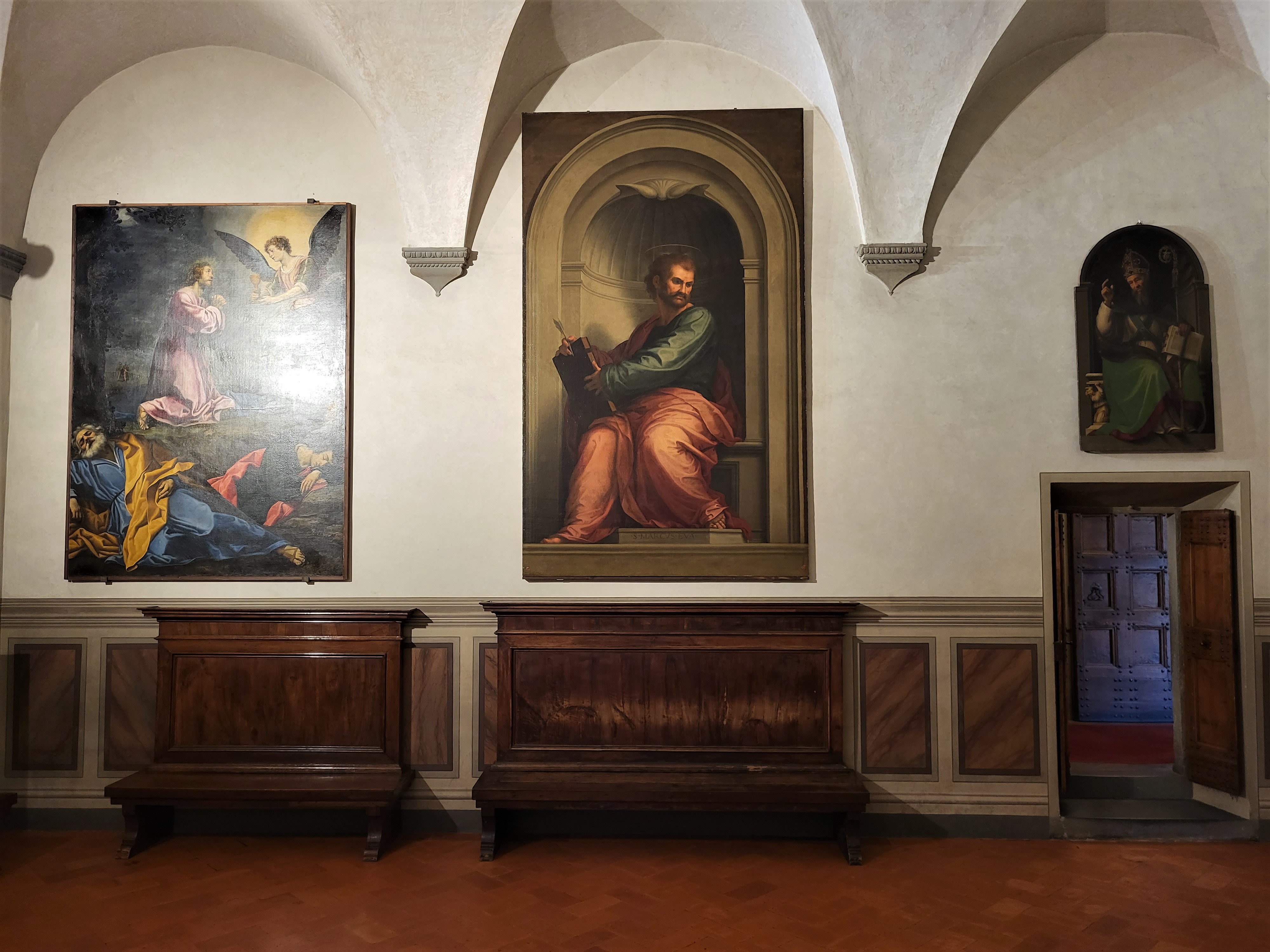 Alle pareti laterali, oltre alle due robbiane (Deposizione di Cristo e Madonna che adora il Bambino) e i due Angeli in marmo della Bottega di Andrea della Robbia, già noti al nostro pubblico, sono ora esposti tre dipinti di notevole interesse, anche se pochissimo conosciuti, recuperati dai depositi del museo. Due sono tele di grandi dimensioni: una del pittore fiorentino Filippo Tarchiani (Firenze, 1576-1645), con l’Orazione di Cristo nell’orto, firmata dall’artista; l’altra raffigurante San Marco evangelista in trono, copia sostitutiva dell’originale di Fra’ Bartolomeo, già nella chiesa di San Marco, fatto trasferire da Ferdinando de’ Medici in Palazzo Pitti (dove ancora si trova), ed eseguita da Antonio Franchi, detto il Lucchese (1638-1709). Di considerevole qualità è, infine, il terzo dipinto: una tavola centinata raffigurante Sant’Agostino benedicente in trono, collocata sopra la porta verso le scale che conducono al primo piano, attribuita a Ridolfo Bigordi, detto Ridolfo del Ghirlandaio (Firenze, 1483-1561), figlio di Domenico. Opere che impreziosiscono la collezione del Museo, completando un catalogo ideale, extra-angelichiano, che dalla Scuola di San Marco, fondata sul magistero di Fra Bartolomeo, prosegue nel corridoio della pittura del Seicento, tra i due chiostri, con le tele di Jacopo Vignali e la grande pala con la Crocifissione di Lorenzo Lippi.