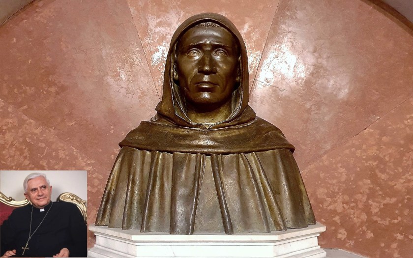 Davanti al monumento scolpito da Giovanni Dupré, vinta la timidezza di prima, con maggiore lucidità e con un pizzico di sfrontatezza, chiesi al cardinal Ratzinger, Prefetto dell’ex Sant’Uffizio, un tempo Santa Inquisizione, se fra Girolamo Savonarola, dopo tanti secoli dalla scomunica e dalla tragica morte, potesse essere riabilitato. Aggiunsi che, a quanto sapevo, i frati di San Marco stavano perorando l’apertura di un processo di beatificazione.