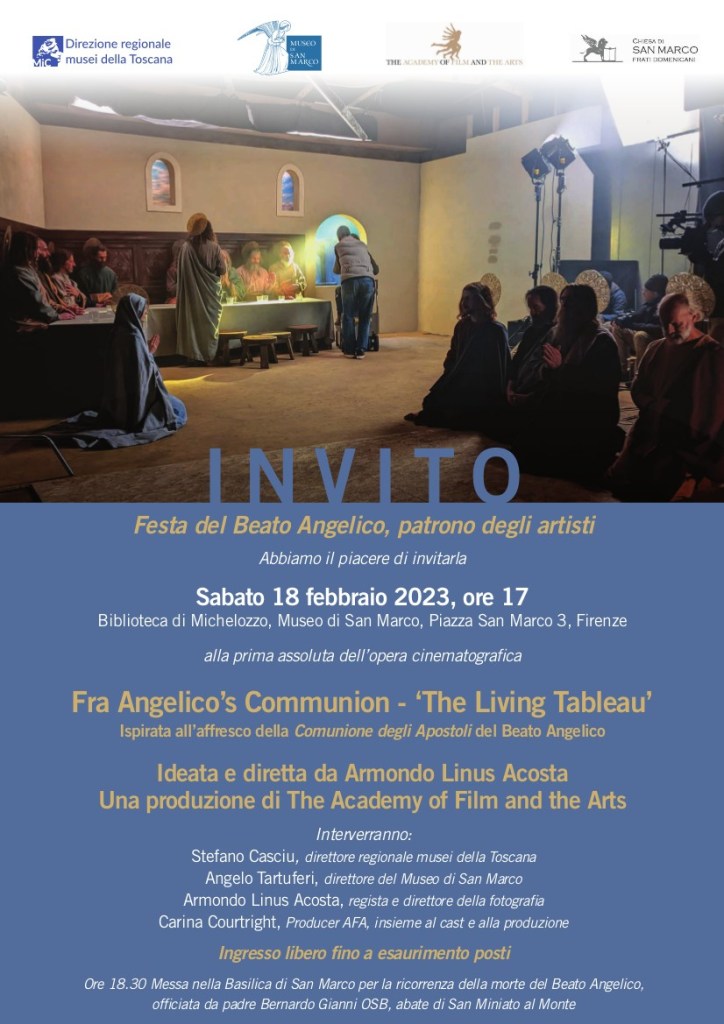 La prima del cortometraggio Fra Angelico’s Communion – The Living Tableau di Armondo Linus Acosta si svolgerà il 18 febbraio alle 17.00 nella Biblioteca monumentale di Michelozzo, al primo piano del Museo, e sarà introdotta da Stefano Casciu, Direttore Regionale Musei della Toscana, Angelo Tartuferi, Direttore del Museo di San Marco, dallo stesso Armondo Linus Acosta, regista e direttore della fotografia, e Carina Courtright, Producer AFA, alla presenza del cast e della produzione. Il corto sarà preceduto dal filmato del backstage con le fasi di elaborazione del progetto.