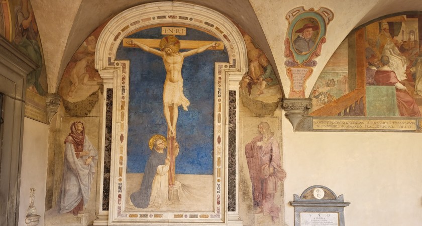 L’affresco con San Domenico in adorazione del Crocifisso del Beato Angelico, nel Chiostro di Sant’Antonino, uno straordinario mix di realismo e di astrazione.
