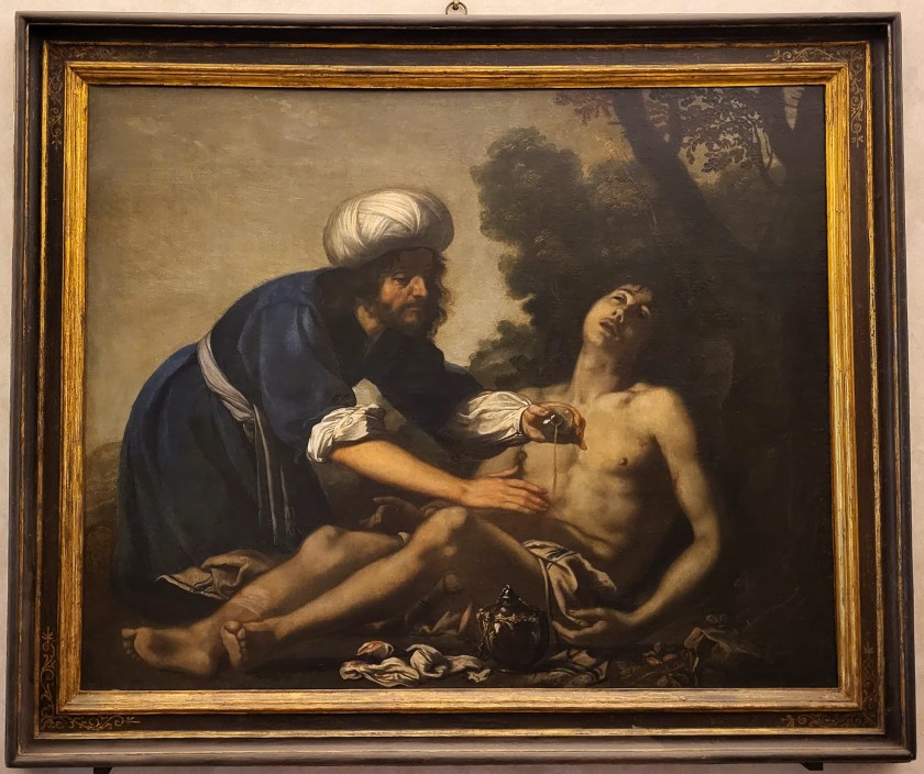 Nel 1630, su committenza dei Domenicani, Vignali dipinge la tela intitolata Il buon Samaritano, cioè «l’Evangelico Samaritano, che medica il Passeggiere dagli Assassini di strada spogliato, e lasciato semivivo per le ferite» (Bartolozzi, p. XI), opera in cui esprime con maggiore consapevolezza stilistica l’essenza della malattia e della sofferenza, il valore della fraternità universale e l’amore incondizionato per il prossimo che trascende la diversitas. Questi elementi iconografici sono abilmente dipinti attraverso espedienti luministici e cromatici che permeano l’intera composizione. Quest’ultima è caratterizzata da un’atmosfera rarefatta, dai toni freddi e tendenti al verdastro, che regola l’impostazione cromatica complessiva e, modulandosi nel corpo pallido e sofferente del giovane, nel panneggio dell’abito blu e bianco del samaritano e nell’ambiente circostante appena definito, agisce sulla materia pittorica e sulla rappresentazione medesima. Il samaritano, secondo la parabola narrata da Gesù a un dottore della Legge, è dipinto in atto di medicare con olio e vino un giudeo che, durante il suo cammino da Gerusalemme verso Gerico, si imbatte in alcuni briganti che lo spogliano e lo percuotono, lasciandolo in fin di vita. Fortunatamente per lui, nonostante le profonde divergenze tra i due popoli e a differenza di un sacerdote e di un levita che, uno dopo l’altro, pur vedendolo in quelle condizioni, lo avevano ignorato, il samaritano decide di fermarsi per curargli le ferite e risanarlo.