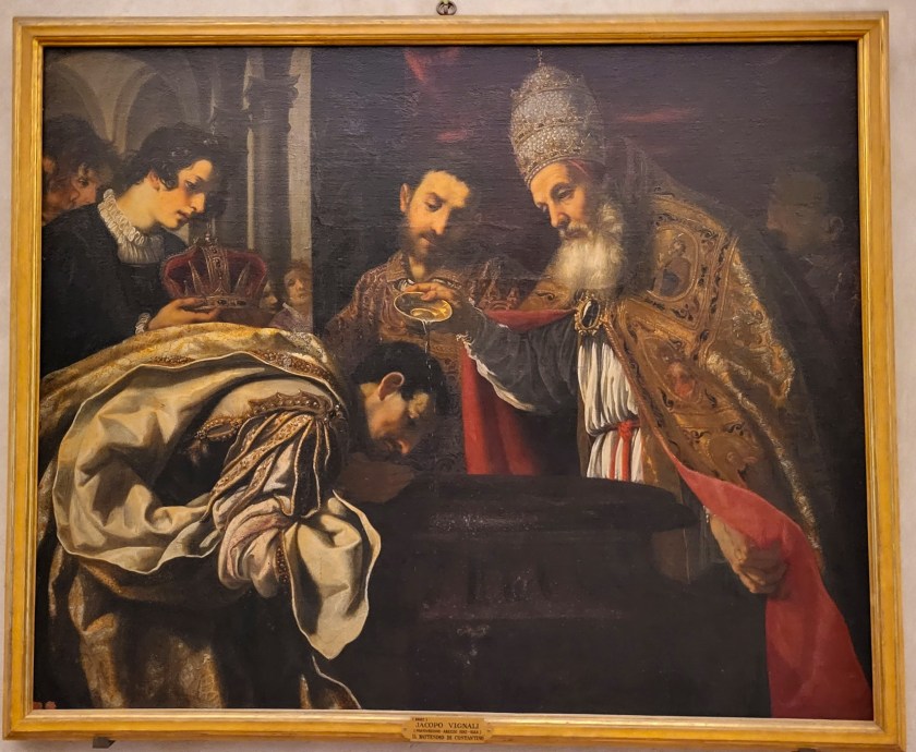 Il quadro con Il Battesimo di Costantino, invece, evidenzia la peculiare attenzione di Vignali ai dettagli che, in questo caso, assumono un ruolo predominante rispetto alle figure. Il dipinto appare difatti caratterizzato da elementi decorativi che arricchiscono la composizione in cui si celebra il battesimo dell’imperatore. L’artista sfrutta vari livelli cromatici per definire plasticamente il simbolico momento di conversione di Costantino che, secondo la testimonianza di Eusebio, riceve tutte le disposizioni richieste, con i preparativi e i riti spirituali che ne assicurino la validità. Costantino, che indossa un abito raffinato dai toni grigi e dorati particolarmente elaborato, è ritratto in atto di ricevere il Sacramento del Battesimo da papa Silvestro (secondo la versione contenuta nella Conversio Constantini all’interno degli Actus Silvestri). La rappresentazione, che segue un andamento prospettico diagonale convergente verso sinistra al di là della grigia architettura e della cornice stessa, include altre sei figure sullo sfondo, divise per piani entro cui sono meticolosamente disposte, come a voler riempire a tutti i costi la tela: a sinistra un giovane regge la corona di Costantino mentre altri uomini (tre sul lato sinistro, uno al centro tra l’imperatore e il papa, e un altro sull’estremità destra del quadro) osservano con silente rispetto ed evidente curiosità lo storico avvenimento. Ogni personaggio è contraddistinto da una particolare compostezza che si evince dalla postura, dai gesti e dagli abiti, e altrettanto si può asserire di altri dettagli quali, ad esempio, la raffinata corona adorna di pietre preziose, l’imponente fonte battesimale, la rossa e maestosa tenda alle spalle del pontefice e dei due uomini accanto a lui, la sfarzosa mitra papale minuziosamente decorata e il piviale (o manto) di papa Silvestro nella sua inconfondibile eleganza di paramento liturgico.