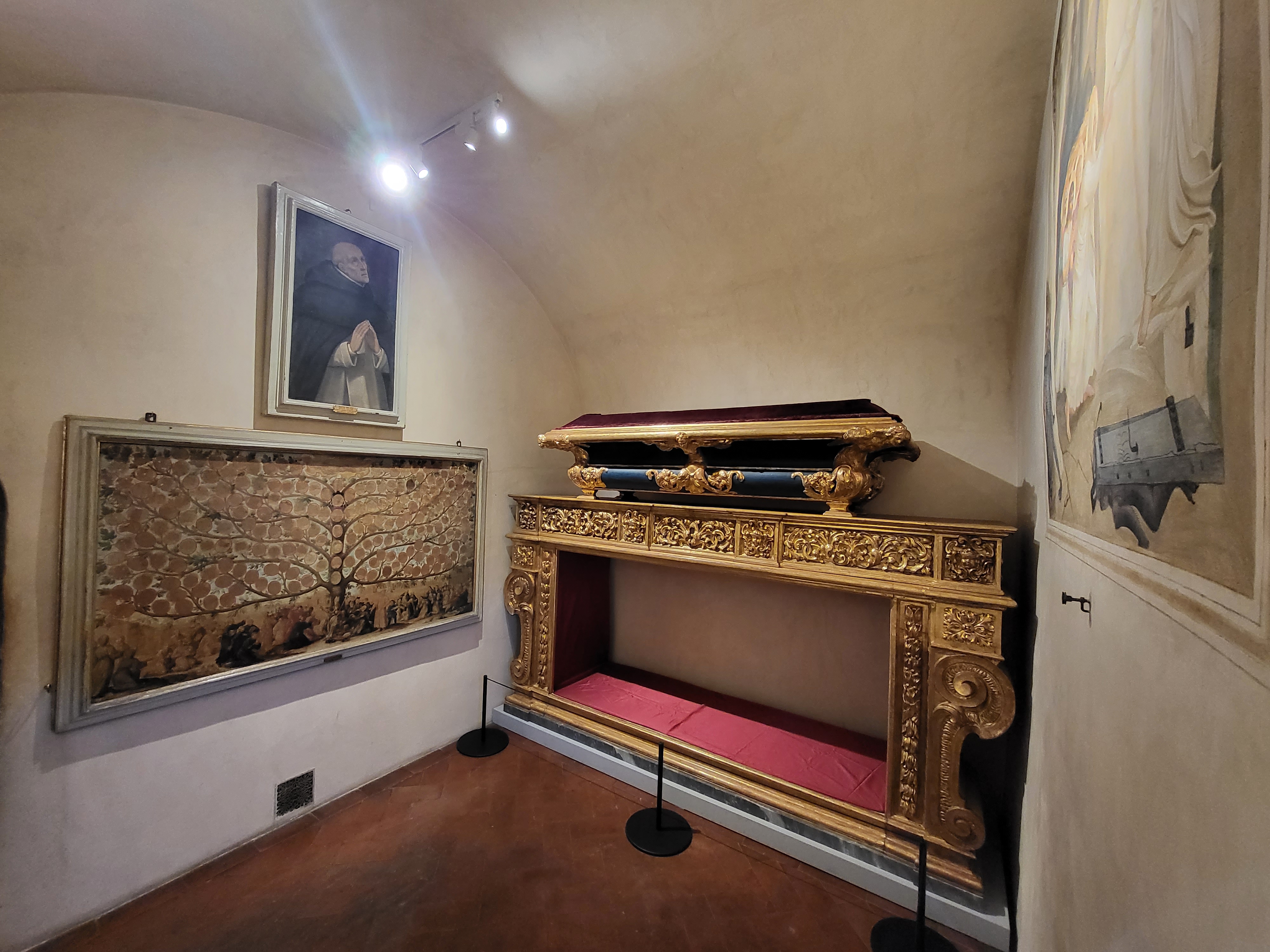 Dopo il riallestimento del Quartiere di Savonarola, inaugurato nel dicembre del 2022 e documentato nel Quaderno N. 4 del Museo, in questa occasione è stata riallestita anche la cella di Sant’Antonino, retrostante la parete su cui è dipinta la celeberrima Annunciazione di Beato Angelico, icona del Museo di San Marco e del primo Rinascimento fiorentino. All’interno della cella è stato ricollocato l’Albero genealogico del santo del secolo XVIII, recuperato dal deposito del Museo e appositamente restaurato, e la grande urna che nel 1869, all’apertura del Museo, conteneva oggetti, reliquie, documenti e opere d’arte legati alla figura di Sant’Antonino. Oggi l’urna è vuota, ma assolverà, come allora, alla funzione di fare da supporto al feretro “celeste e oro”, sopra al quale il corpo del Santo fu traslato nella cappella Salviati, nel braccio destro della basilica di San Marco, e portato in processione in occasione della peste del 1630.