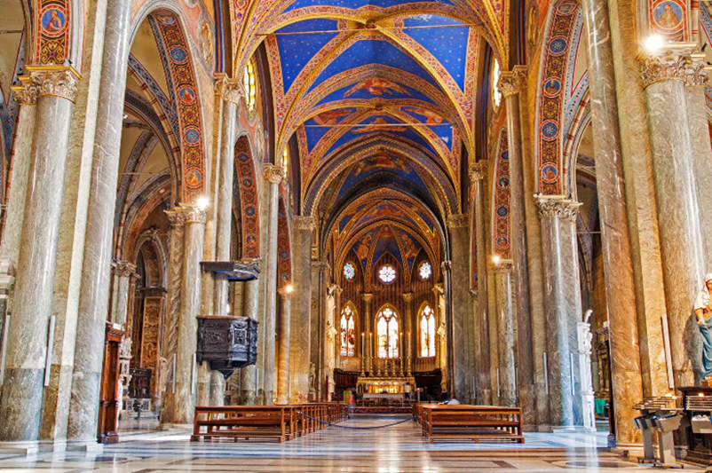 All’interno della Basilica possiamo ammirare alcuni capolavori degli artisti più importanti del Rinascimento tra i quali: un Cristo Redentore portacroce di Michelangelo a sinistra dell’altare, la cappella Carafa con affreschi di Filippino Lippi dedicati a san Tommaso d’Aquino, l’Annunciazione di Antoniazzo Romano (pittore del quale a San Marco è esposto un pregevole tabernacolo portatile), il Cristo salvatore del Perugino e una Madonna col Bambino del Beato Angelico. Per quanto riguarda le sepolture, troviamo Santa Caterina da Siena, copatrona d’Italia e d’Europa, dietro l’altare maggiore, i due papi medici Leone X e Clemente VII nel coro, papa Urbano VII nella cappella dell’Annunciazione, papa Paolo IV nella cappella Carafa, papa Benedetto XIII nella cappella di San Domenico, il cardinale spagnolo Juan de Torquemada sempre nella cappella dell’Annunciazione e infine il Beato Angelico in una delle cappelle a sinistra dell’altare.
