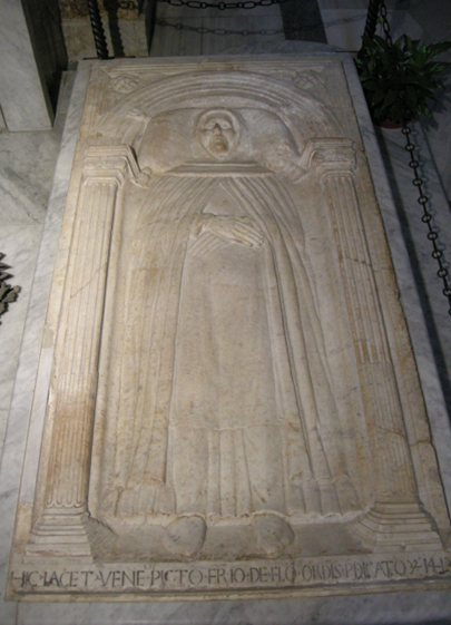 Il sepolcro di fra Giovanni, proclamato patrono universale degli artisti da papa Giovanni Paolo II nel 1982, ha subito vari rimaneggiamenti nel corso dei secoli; rappresenta però uno dei primi esempi di tomba monumentale dedicata a un artista. Si tratta di una semplice lastra marmorea con la raffigurazione a bassorilievo del pittore, eseguita da uno scultore ignoto. Il suo corpo è rappresentato entro una nicchia, con la testa posta su un cuscino, nel suo abito monacale, a piedi scalzi come da tradizione domenicana: il frate dimostra così di aver consumato i calzari nel suo lungo cammino di predicazione. Il volto realistico è modellato su una maschera funebre. Un’iscrizione posta ai piedi del frate recita: Hic iacet venerabilis pictor frater Ioannes de Florentia Ordinis Predicatorum 14LV (Qui giace il venerabile pittore frate Giovanni da Firenze dell’Ordine dei Predicatori morto nel 1455). Su un lato è stata riportata una data di nascita (1387) tratta dalle Vite di Giorgio Vasari, che è ormai stata smentita dagli studi più recenti che collocano la nascita del frate tra il 1395 e 1400 a Vicchio di Mugello. In anni recenti la lapide ha subito interventi di restauro in seguito a un evento vandalico: l’8 aprile 2018 è stata presa a martellate, danneggiando il cuscino e la nicchia.