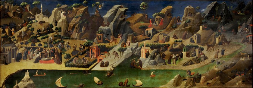 Il dipinto rappresenta con una ricchezza straordinaria di particolari le vite dei Santi Padri nel deserto, presso Tebe. Un paesaggio eremitico e montuoso, con a valle un fiume pieno di barchette, è popolato da una serie di piccoli personaggi che si affaccendano presso i romitori dei monaci; e poi animali, santi che resistono alle tentazioni del maligno, chiese, orti, alberi e una piccola folla di fedeli che vegliano Sant’Efrem. La scena è priva di un punto focale preciso e si scompone in una miriade di dettagli che inducono lo sguardo a perdersi, nella ricerca di particolari aneddotici e curiosi.