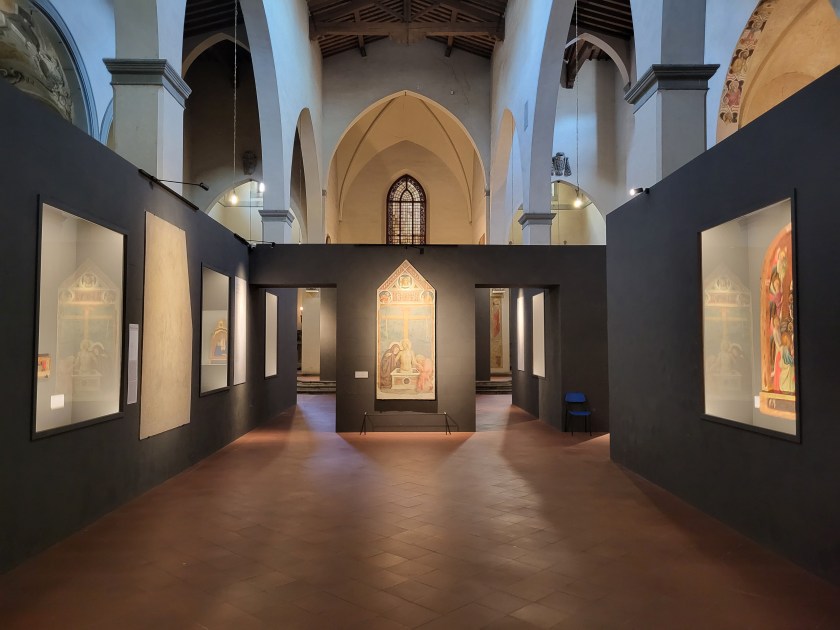 All’interno della Collegiata incontro Andrea De Marchi e Francesco Suppa, due dei tre curatori della mostra, in compagnia di due ospiti illustri: Carl Brandon Strehlke, uno dei maggiori esperti al mondo di pittura di Beato Angelico, che di lì a poco avrebbe tenuto la conferenza sulla giovinezza dell’artista domenicano, e Keith Christiansen, Direttore emerito del Dipartimento di Pittura europea “John Pope-Hennessy” del Metropolitan di New York. Stanno discutendo della mostra da prospettive culturali, intellettuali e politiche diverse, mentre attraversano le sale del museo. Cerco di origliare i loro commenti. Li seguo anche nella Chiesa di Santo Stefano, dove l’esposizione è giustamente dominata dalla splendida Pietà di Masolino, collocata in fondo alla navata centrale, su un pannello grigio antracite che, correndo su tutti i lati, contiene i dipinti in prestito da musei toscani ed esteri.