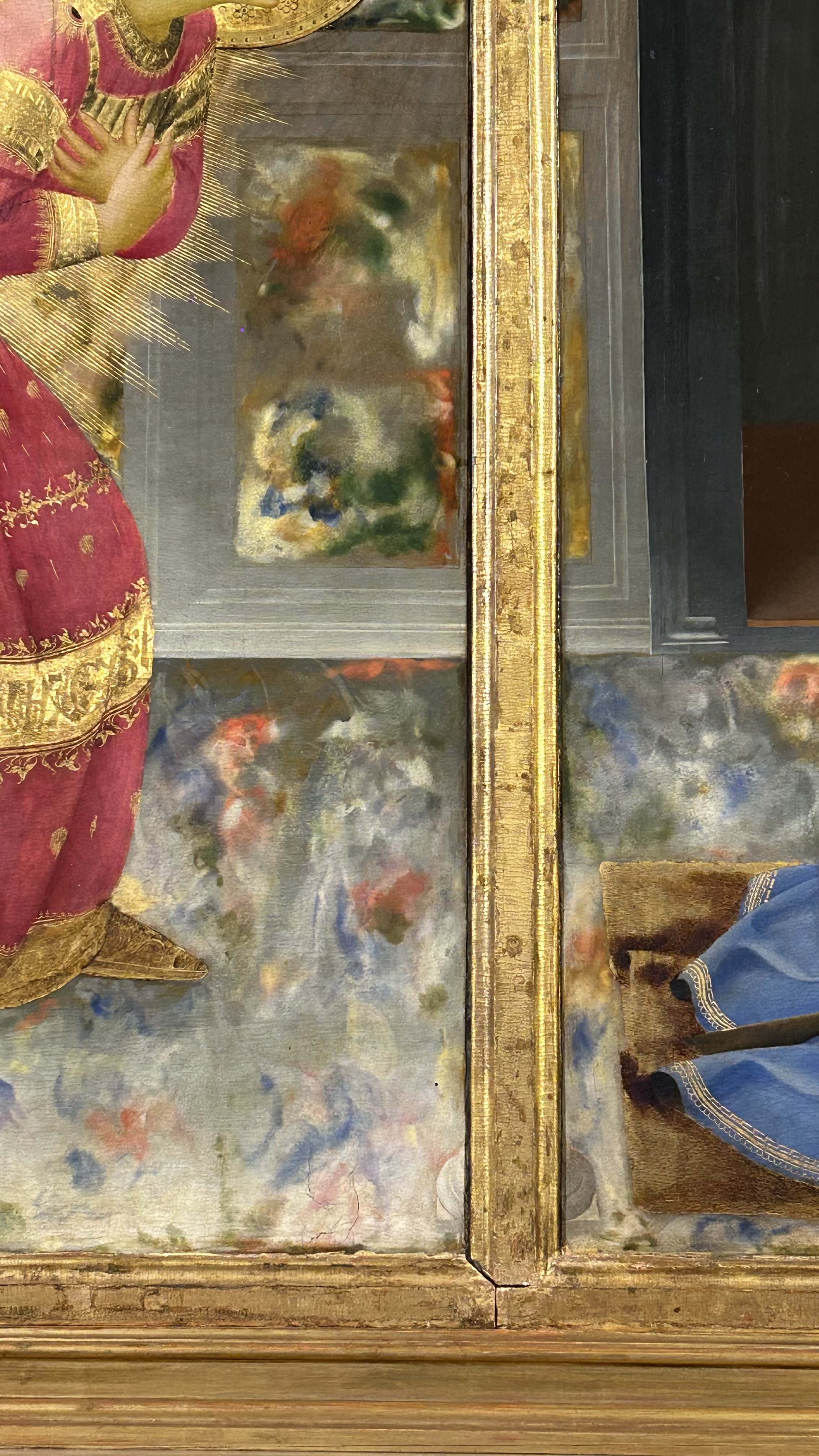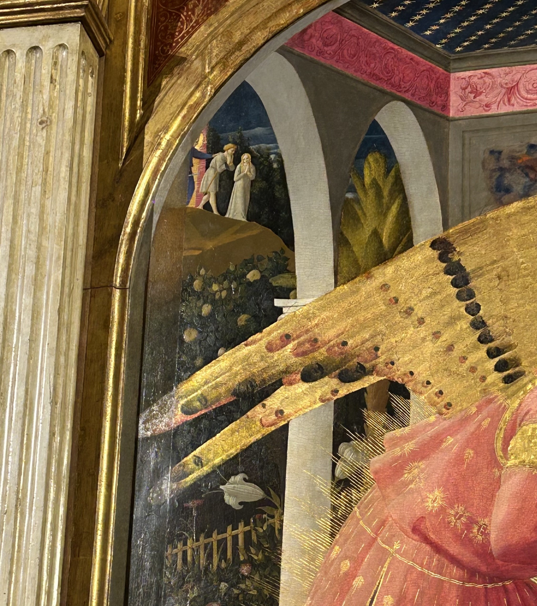 L’interno del loggiato, dove si svolge la scena, è caratterizzato da un pavimento di marmi colorati, che rivestono anche le pareti; il soffitto è decorato da uno sfondo blu, trapuntato di stelle dorate; un fregio rosa con un tralcio vegetale monocromo corre sugli archi all’interno del porticato. L’inserimento di questi dettagli non è casuale: il cielo stellato rappresenta il mondo divino, il pavimento decorato con marmi policromi indica la natura multiforme del mondo terreno, mentre il fregio ha il compito di unire i due mondi. In fondo, questo rappresenta il significato stesso dell’Annunciazione: una donna è chiamata a concepire un figlio che è Dio stesso fatto uomo, venuto per salvare l’umanità. Dietro la Vergine scorgiamo la sua umile stanza, della quale vediamo solo una panca di legno molto semplice e una finestra da cui entra una flebile luce.