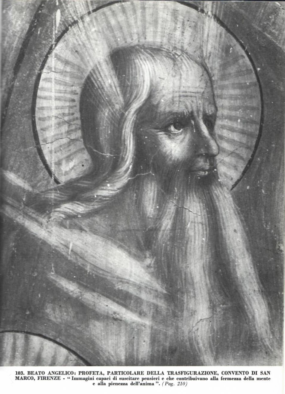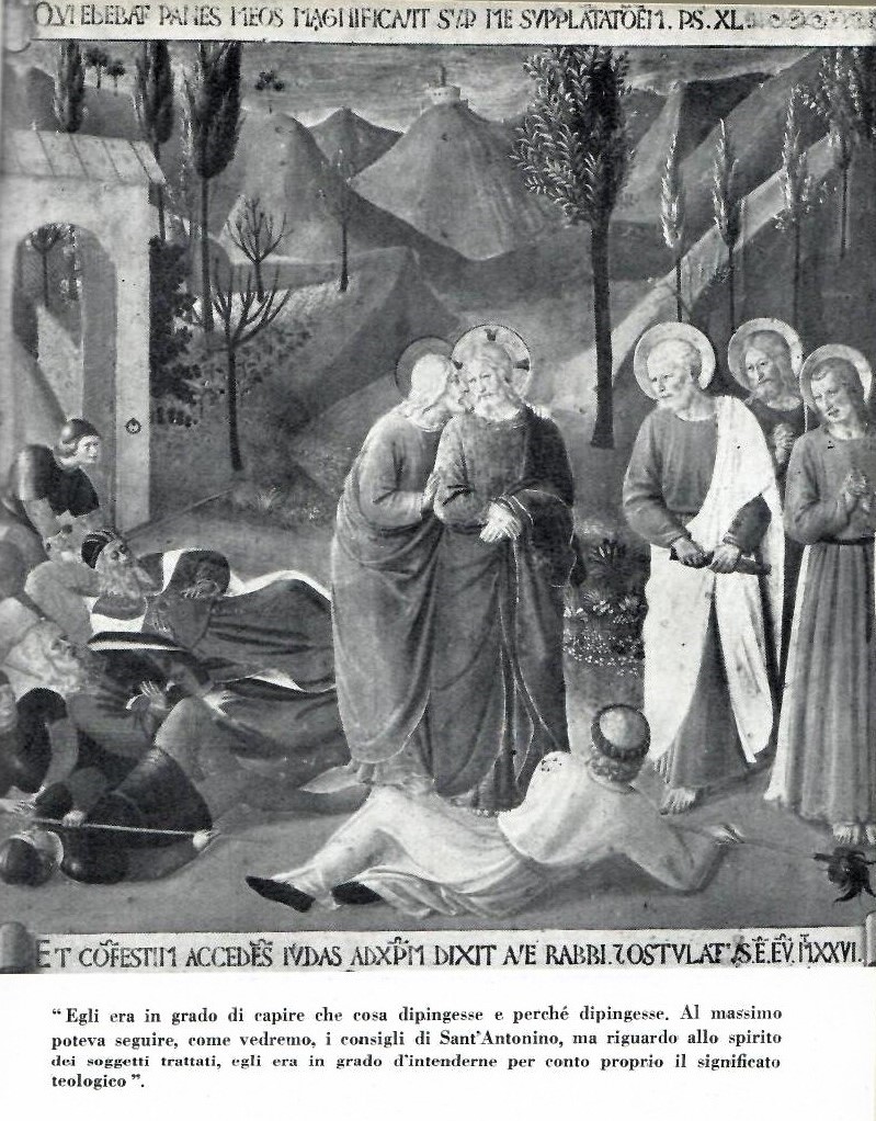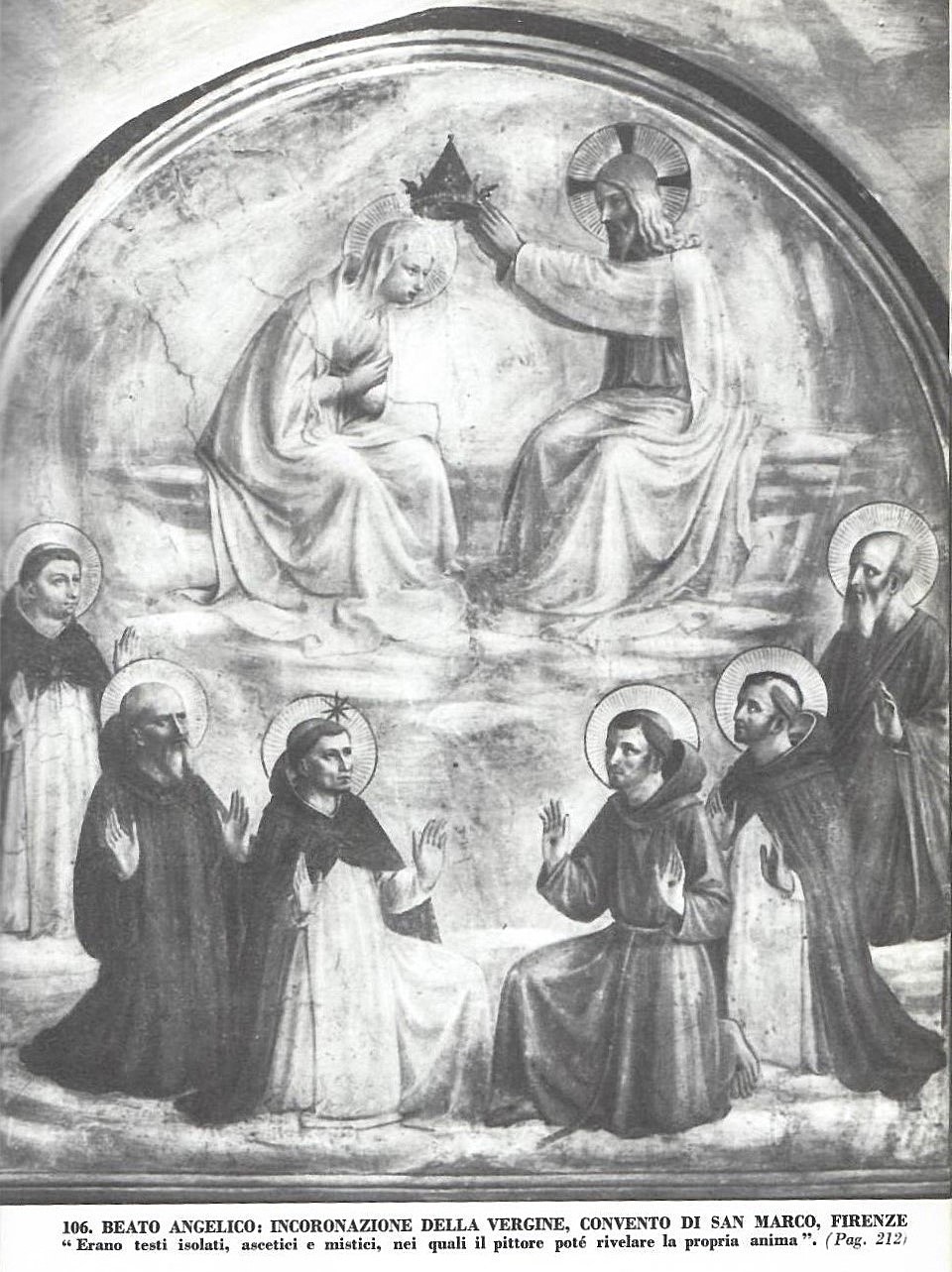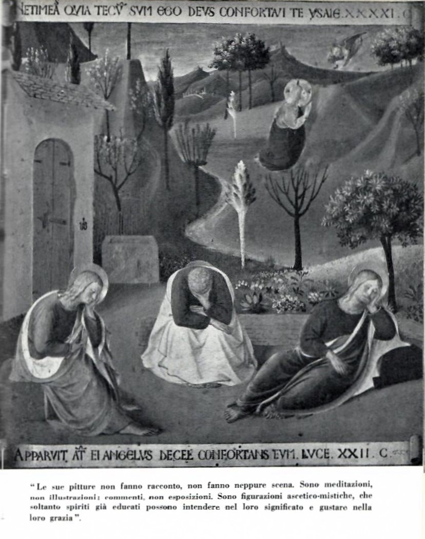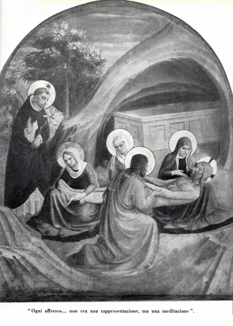 (…) il Beato Angelico entrava in ogni cella e vi depositava un testo di meditazione e di preghiera. Dinanzi a quell’affresco, i frati dovevano recarsi alla mente la verità della fede che il quadro rappresentava. O si trattava di un mistero doloroso, o di un mistero gaudioso, o di un mistero glorioso. Invano si cercherebbe nelle celle di San Marco la storia di Gesù come la poteva concepire un trecentista. Ogni affresco del Beato Angelico non era una rappresentazione, ma una meditazione. Stabiliva un colloquio intimo fra il soggetto e l’anima del riguardante. La figurazione non doveva narrare, ma suggerire un comportamento spirituale; non doveva suscitare una curiosità, ma svegliare un sentimento di pietà. Costante e insistente vi era il richiamo al sacrificio, o meglio al sangue che del sacrificio è indelebile sigillo. Il Beato Angelico non sarebbe stato un seguace di Santa Caterina da Siena, se non avesse avuto questo acuto sentor di sangue nelle sue pitture (p. 186).