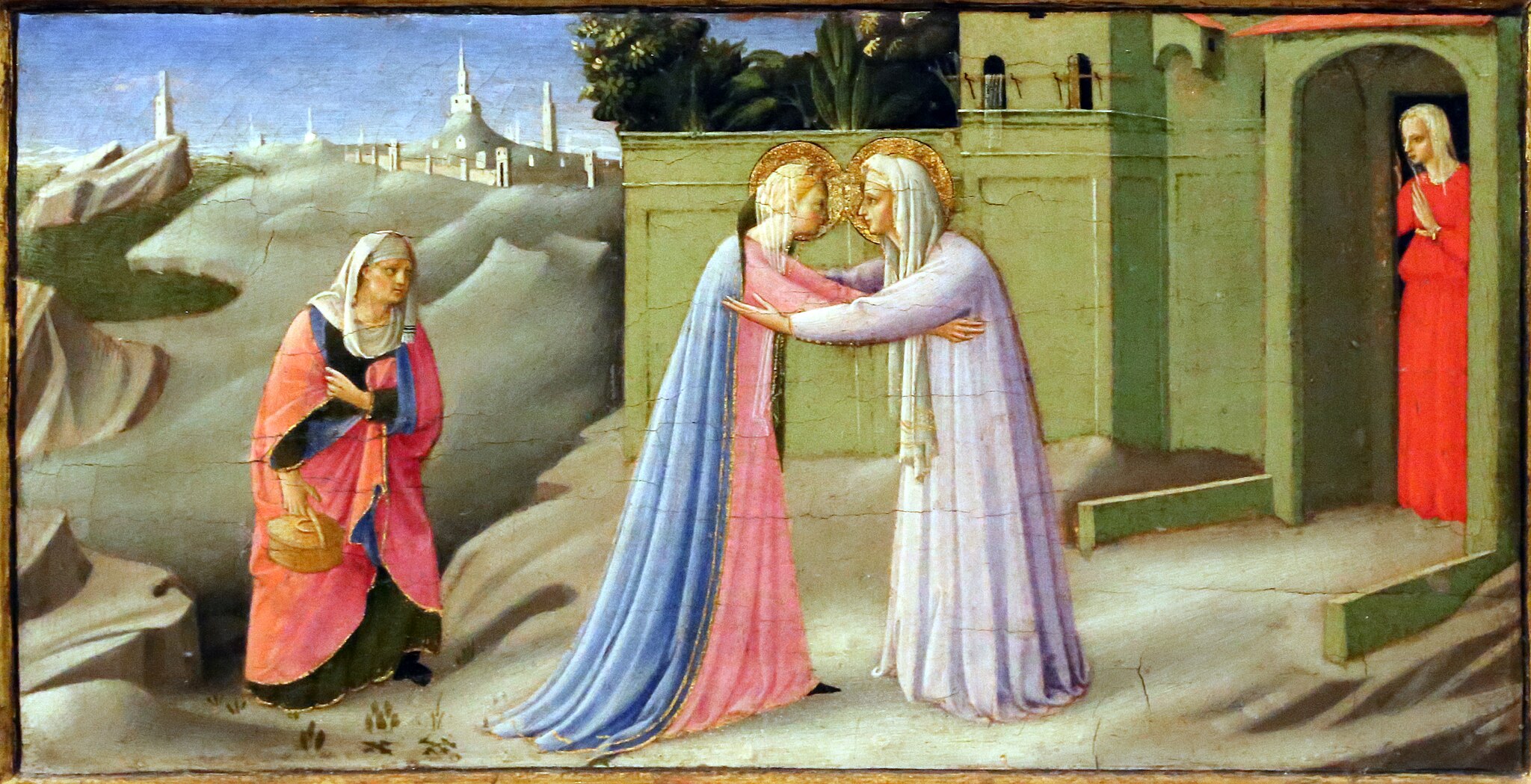 Il tenore delicato dei sentimenti e dei gesti, l’atmosfera meditata e ordinata delle relazioni silenti fra figure e paesaggio, si direbbero per Lega un dato sentito e continuativo di attenzione all’Angelico. Antonio Paolucci (2007), stringeva i richiami fra La Visita (1868, Roma, Galleria Nazionale d’Arte Moderna) e la Visitazione della predella dell’Annunciazione dalla chiesa di Montecarlo (San Giovanni Valdarno, Museo della basilica di Santa Maria delle Grazie), dove le figure bibliche sono traslate nella terrena affettuosità sull’aia di un podere toscano.