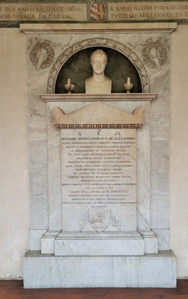 Il governo napoleonico destinò alcuni locali del Convento di San Marco e dell’Accademia a ospitare il patrimonio di opere d’arte e di libri provenienti dalle soppressioni delle Corporazioni religiose. Subito dopo, con l’arringa del 3 maggio 1812, il barone Giovanni degli Alessandri (1765-1828), amico stretto di Antonio Canova, che era presidente dell’Accademia e per Statuto Direttore della Galleria degli Uffizi, in qualità di Conservatore dei Beni della Toscana impedì che il Convento di San Marco fosse distrutto per costruire una piazza d’armi, e il suo monumento funebre, eretto nel chiostro di Sant’Antonino nell’attuale Museo di San Marco, fu eseguito in forme pulite da Stefano Ricci, allora Titolare della Cattedra di Scultura dell’Accademia.