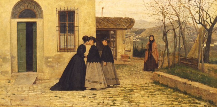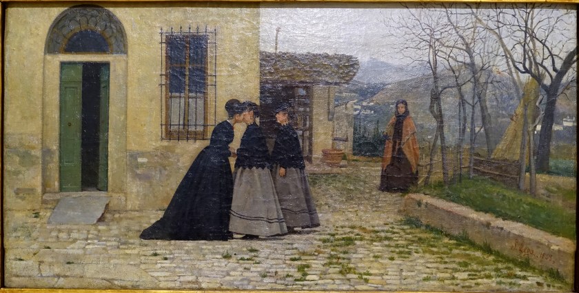 Borrani si ritirò, dal 1865, per otto anni, nella campagna di Piagentina, «serio quanto non lo era mai stato», dice Cecioni, che si apriva fuori la Porta alla Croce – dove già era stato intorno al 1861 con Abbati, Lega, Sernesi e Signorini. Qui si direbbe aver ripensato molto l’Angelico: per gli scuri contrastati e i toni accesi e felici di un intimo sentire patriottico (Ventisei aprile 1859, presentato nel 1861, Cucitrici di camicie rosse, del 1863); per la purezza delle vedute sulla campagna, ricomposte con «geometria pura» (Del Bravo, 2001); per la serietà degli affetti e la profondità della devozione, nelle figure stagliate nell’atmosfera astrattiva dei chiostri claustrali.