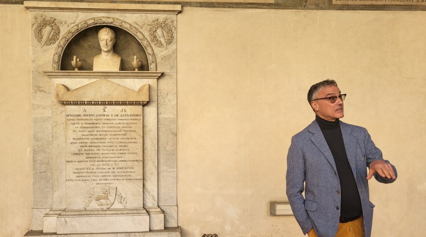 Carl Brandon Strehlke, curatore della mostra Beato Angelico, accanto al monumento funebre di Giovanni degli Alessandri a San Marco