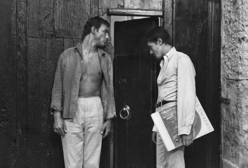 Maurice Ronet (Philippe Greenleaf) con Alain Delon (Tom Ripley) che regge sotto il braccio la monografia Fra Angelico di Anna Banti, nel film Delitto in pieno sole di René Clément, 1960